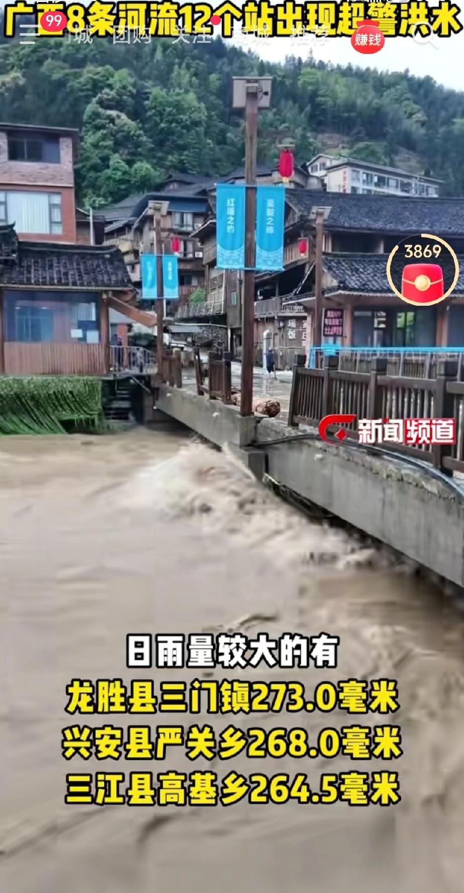 4月20日8时至21日8时,桂林、柳州、河池、百色、贺州、梧州等市降大到暴雨,局部大暴雨到特大暴雨。其中日雨量较大的有龙胜县三门镇273.0毫米、兴安县严关乡268.0毫米、三江县高基乡264.5毫米。受强降雨影响,全区共有古宜河及支流六漫河、大溶江、湘江支流万乡河、资江等8条河流12个站点出现超警0.05~2.61米的洪水,这是广西今年首轮超警洪水过程。自治区水文中心预测,未来24小时柳江、桂江、湘江、龙江及支流环江、中洲小江等江河将出现1~3米的涨水过程,桂林、柳州及河池等市部分中小河流可能出现超警洪水。(来源于@广西新闻频道 )