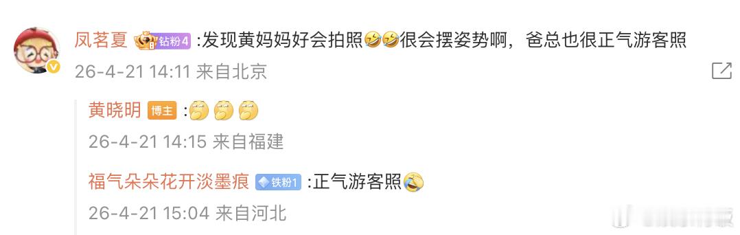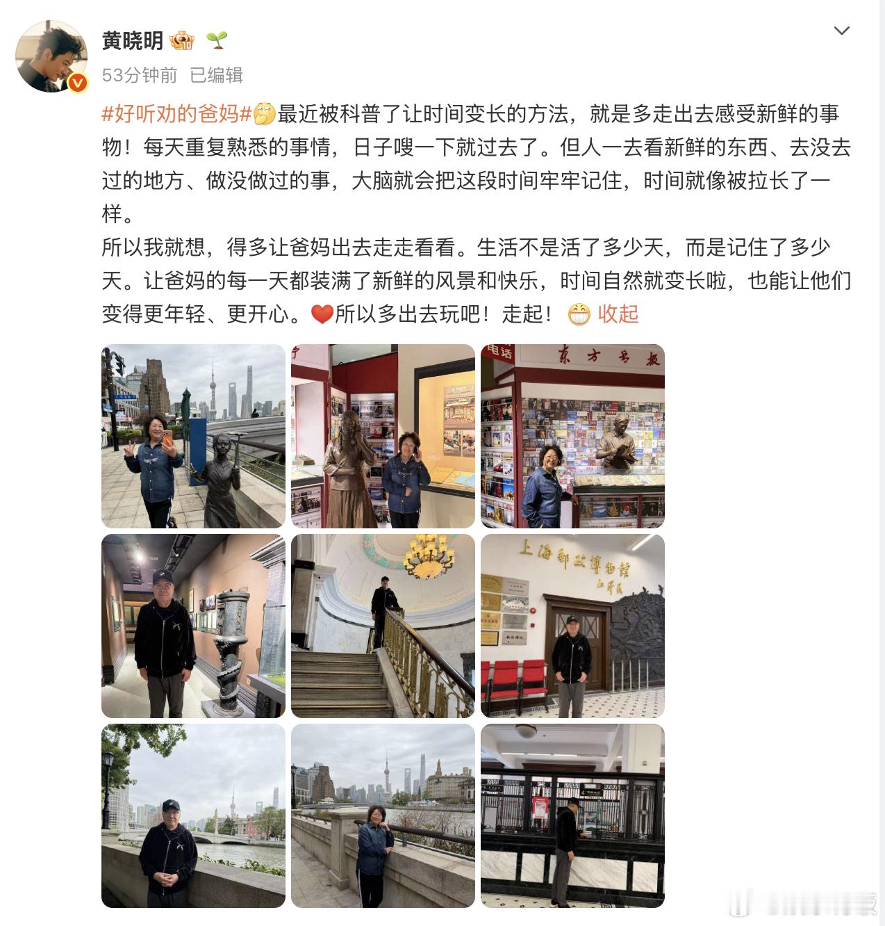 黄晓明妈妈好会拍照 爸爸也是个游客黄晓明带爸妈旅游也得拍游客照 黄晓明带爸妈旅游也得拍游客打卡照 但是一家人一起出行真的很温馨,不仅“时间会变慢”,还可以一起留下很多回忆,想看晓明哥旅行vlog的举手!