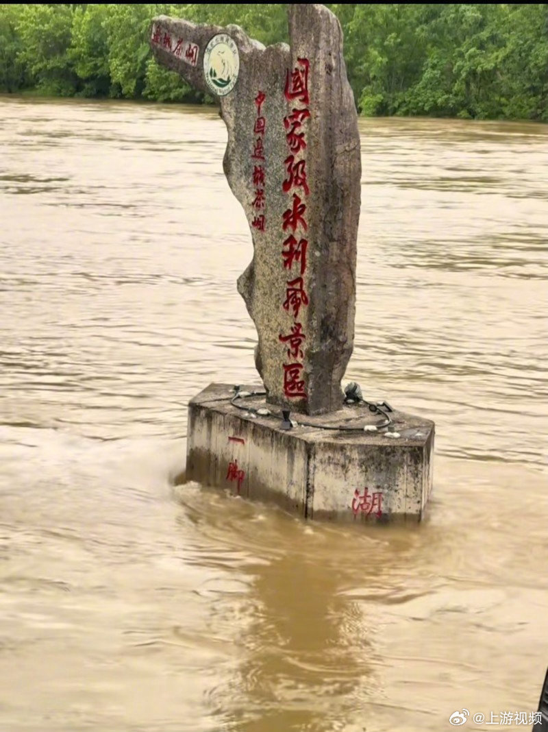 由于湖南湘西地区遭遇暴雨,当地边城茶峒景区受到影响。有游客准备到“一脚踏三省”的地标石碑打卡,结果发现“一脚踏三省”五个字淹得只剩“一脚”两个字还露在水面上。