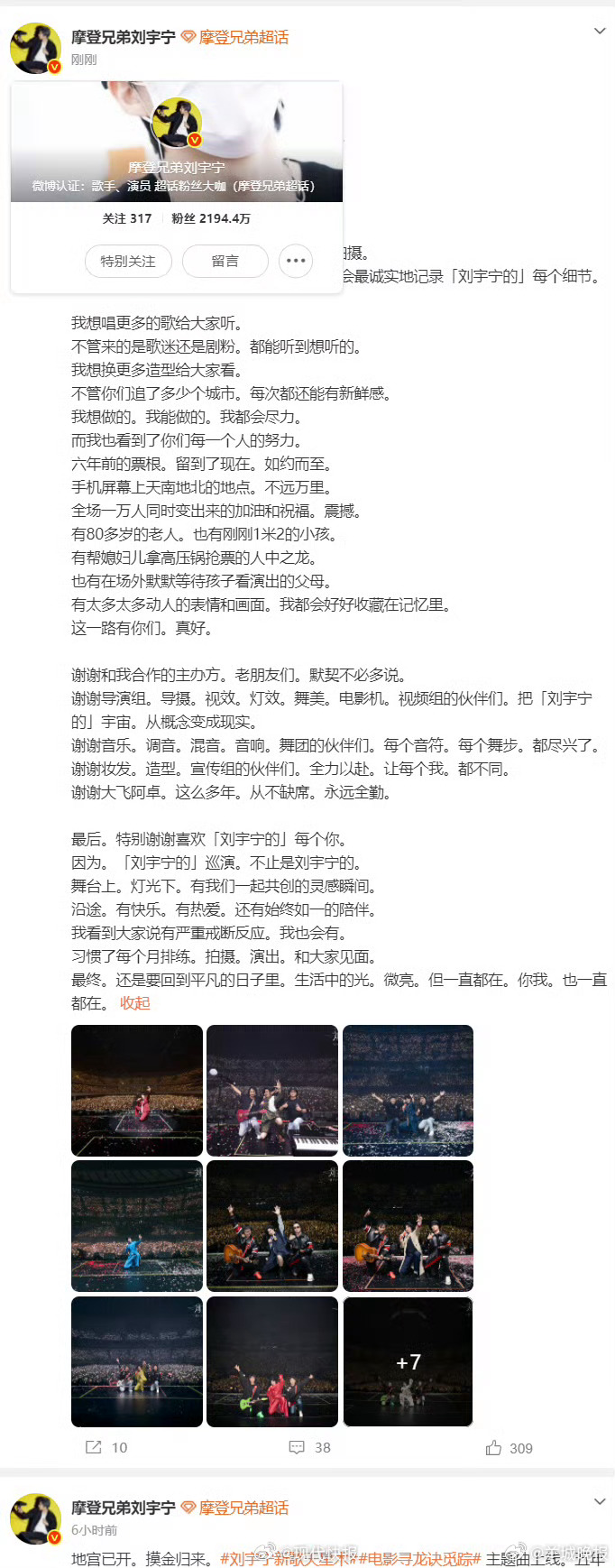 【#刘宇宁2025巡演收官发文#】4月21日,为演唱会收官发文:
