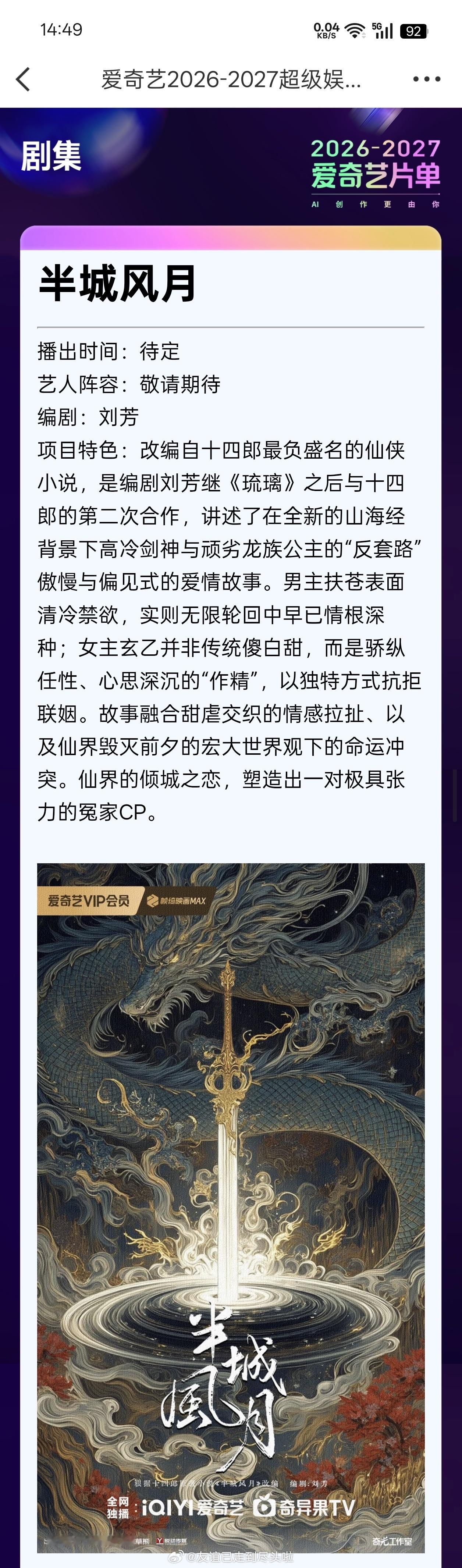 🍉仙侠剧《半城风月》成毅编剧刘芳(《莲花楼》《琉璃》)拧巴作精龙女x看似高冷实则情根深种剑神,不是有名瓜主的爆料看看就好,我看到的消息是马上进组现代剧