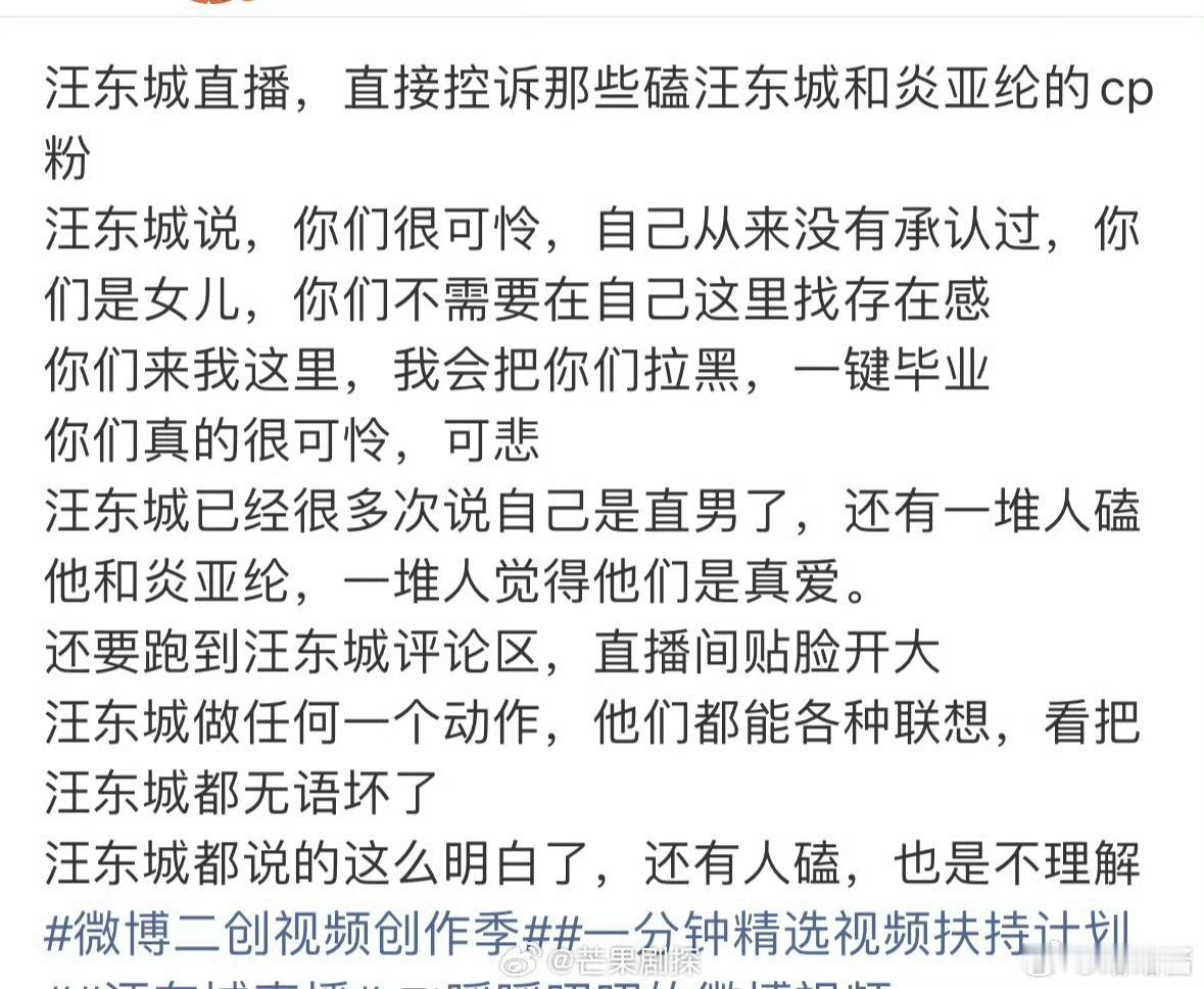 汪东城劝CP粉不要沉迷于幻想汪东城说CP粉内心是空虚寂寞 都说了自己是直男了,还在嗑CP的是怎么想的