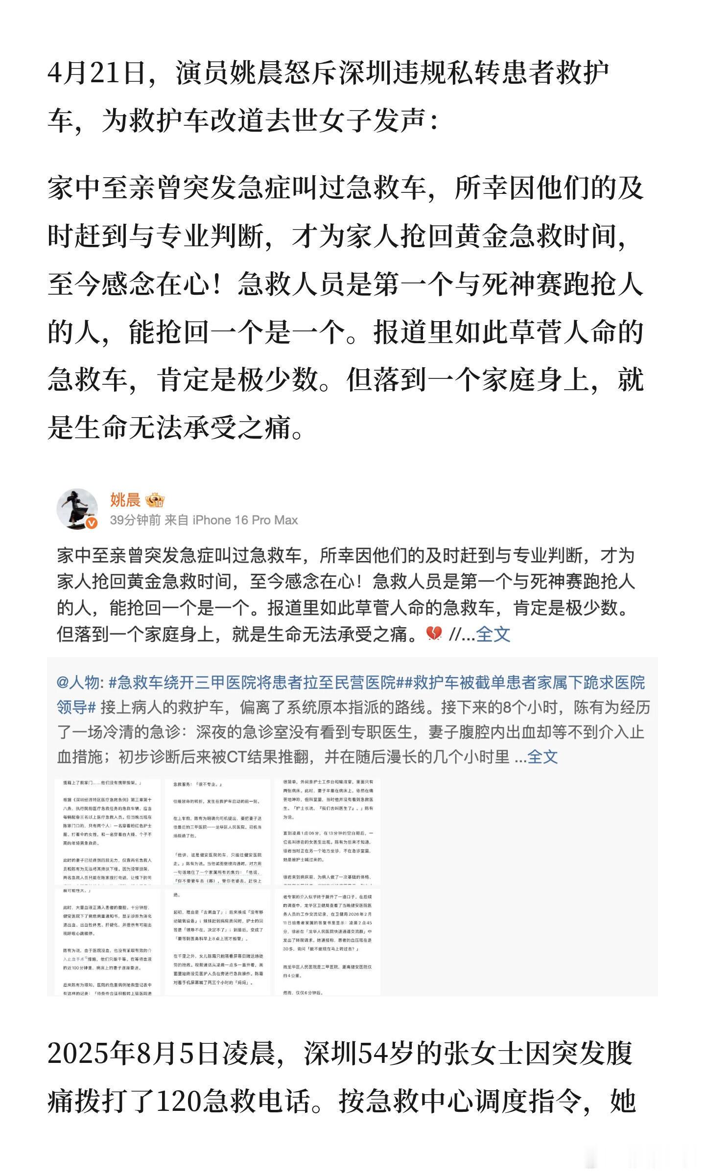 姚晨怒斥深圳违规私转患者救护车终于有人敢站出来揭露真相,这背后恐怕早有隐情!人命关天,必须重视!