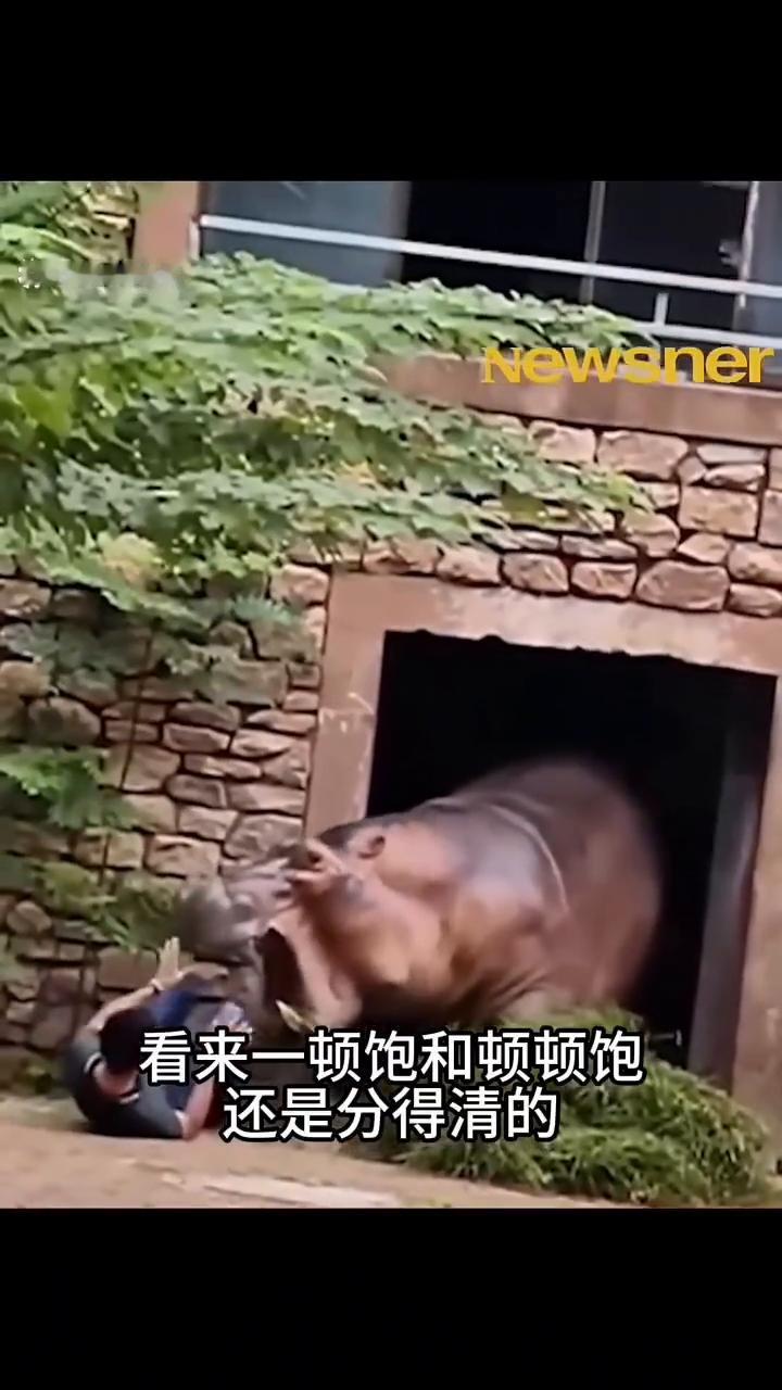 这只看着像淹死的猪,其实是河马在睡觉。河马的咬合力比狮子和鳄鱼还恐怖,南瓜拿刀切都费劲,河马一口就咬碎了。大西瓜塞进嘴巴,一口一个嘎嘣脆。饲养员不小心滑倒了,河马没有攻击它,只是张大嘴巴发泄不满。河马那么大的体格子,如果真的咬,这个男的早就没了。看来一顿饱和顿顿饱还是分得清的。