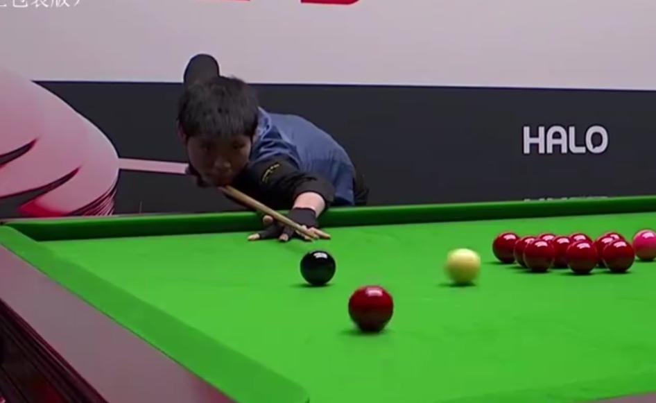 第七局,贺国强解球碰到黑球被罚7分。贺国强上手打出单杆77分,77:7再下一局,把局分追到2-5。