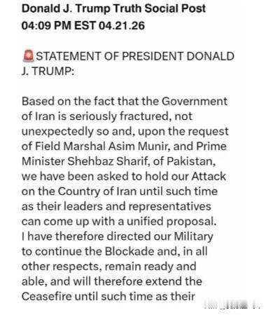 当地时间2026年4月21日,美国前总统、现共和党领导人唐纳德·特朗普在其“真实社交”平台发布重磅声明,宣布将暂缓对伊朗的军事打击行动,并延长停火期限,为外交斡旋争取关键时间窗口。