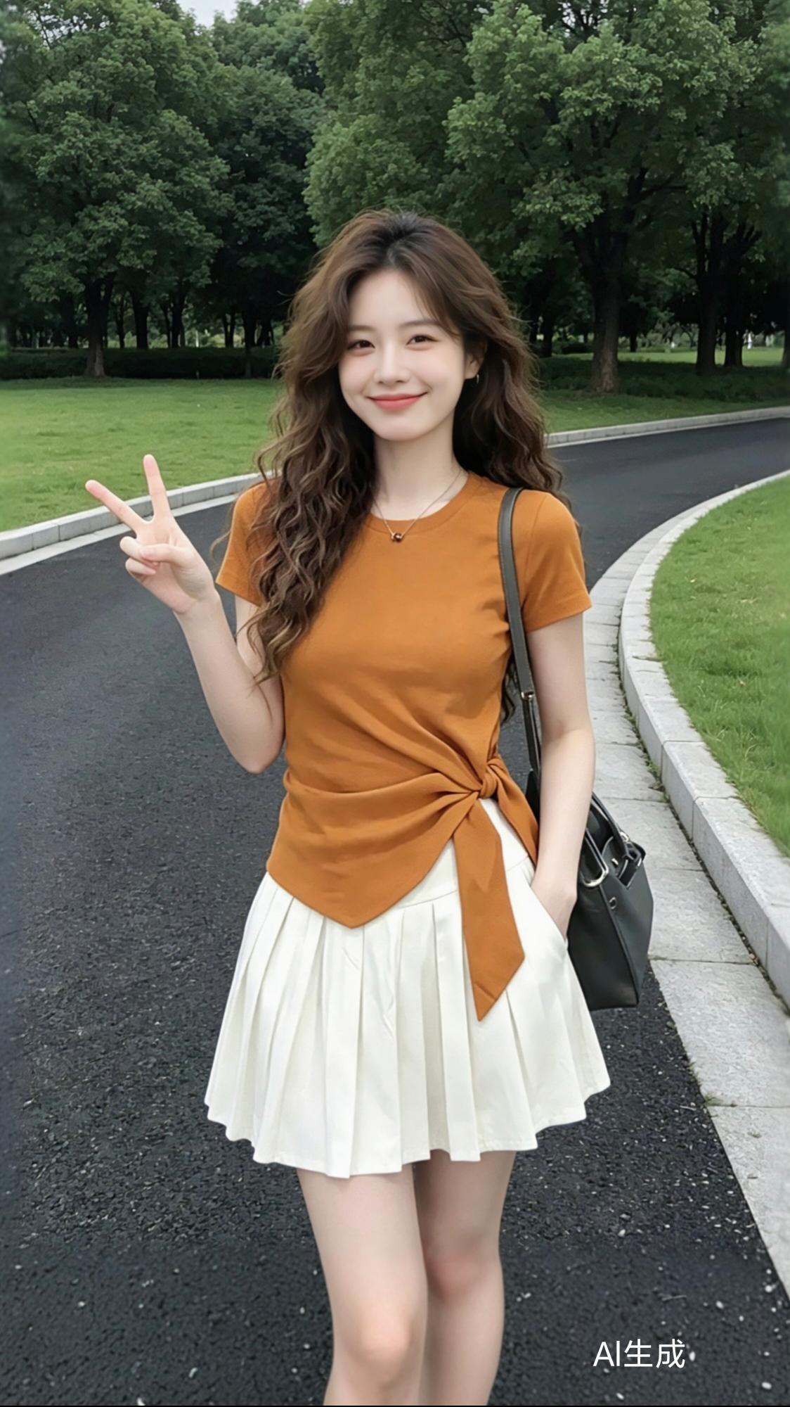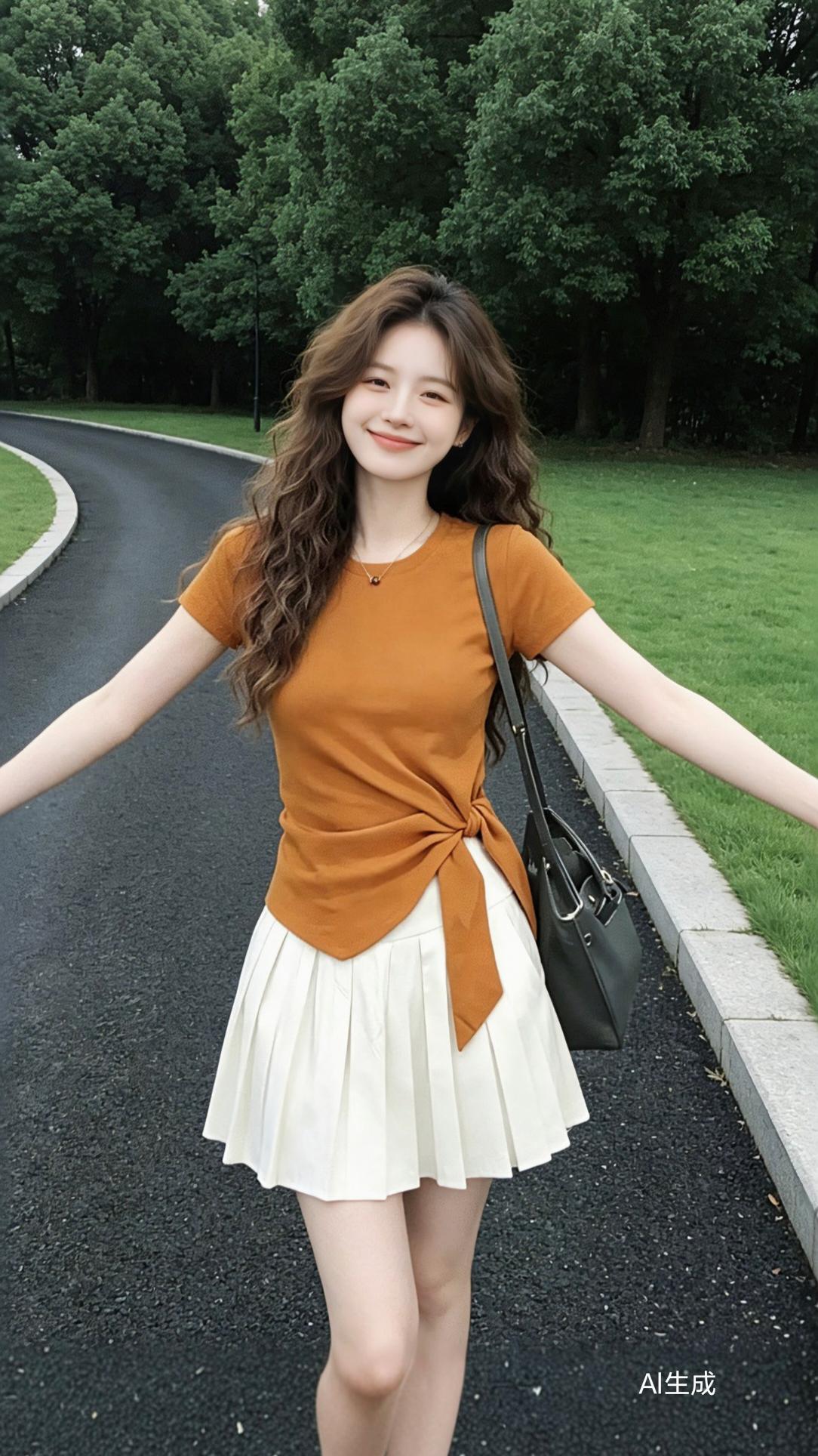 今天逛街的时候,看到一个女生,她穿着休闲,手拿小包,很时尚。她上身穿了件宽松的白