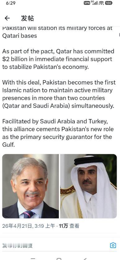 先把这笔账算明白,你就知道卡塔尔有多 “急”,巴基斯坦有多 “值”。卡塔尔给出的 20 亿美元,不是贷款,不是投资,是无条件即时财政援助,到账即自由支配。而巴基斯坦要做的,是派出一支常态化部队进驻卡塔尔,涵盖空军战机、地面安保力量、军事顾问团队,负责卡塔尔防空、基地防卫、人员训练,协议有效期长达数年,绝非短期 “雇佣兵” 式合作。