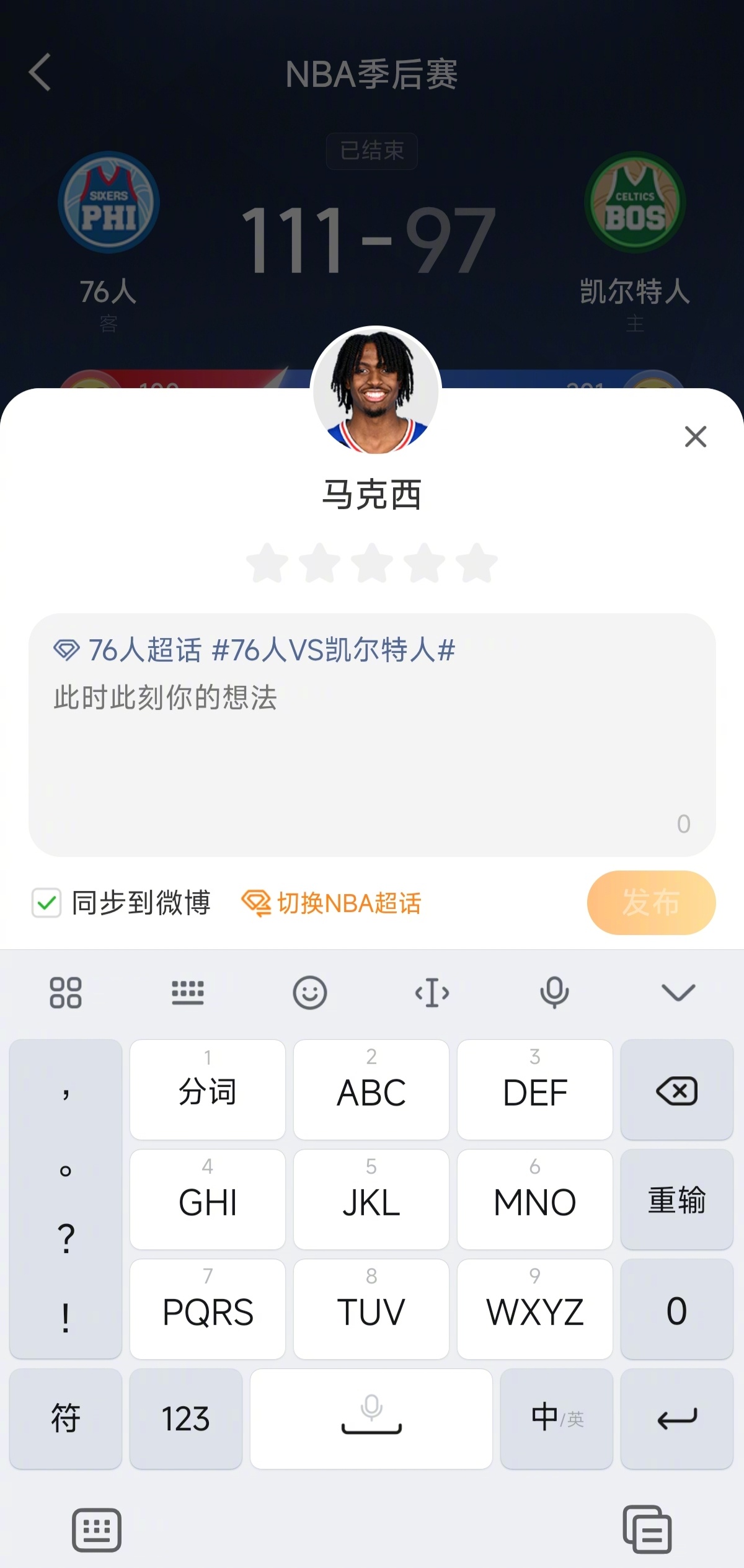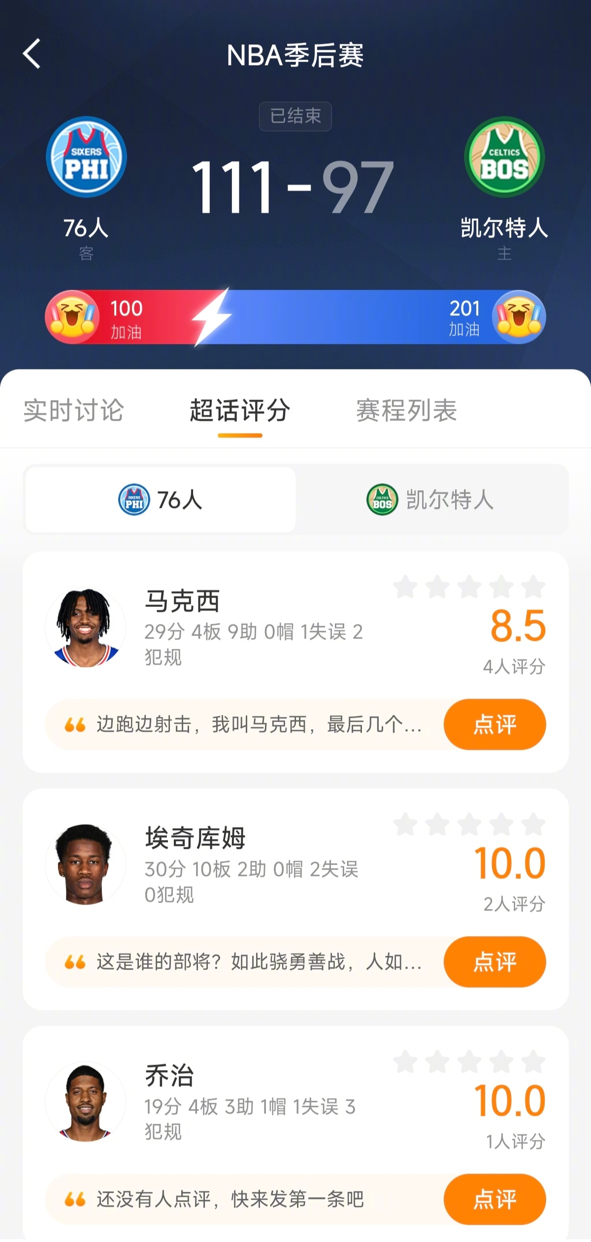 一起来超话NBA76人波士顿凯尔特人为球员评分,原创发布点评就可抽取随机红包,神评还能获得额外激励~