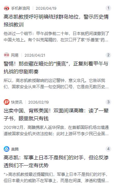 甲午战争前,日本花了几十年时间渗透中国,清政府浑然不觉。抗日战争前,日本的情报网早已覆盖全国,当时的中国积贫积弱,无力防范。这些惨痛的历史教训告诉我们一个最简单的道理:和平年代不能放松警惕,国家安全的防线必须牢牢守住。从甲午到抗战,敌人的套路从未改变——先以各种伪装渗透摸清底细,再抓住弱点发动进攻。高志凯教授敲响的这记警钟,是要我们看清楚一个铁律:任何一场针对中华民族的侵略战争,都不是突然发生的,它前面必然伴随着漫长而隐蔽的情报渗透、战略试探和力量评估。居安思危,警钟长鸣,才能避免重蹈覆辙。