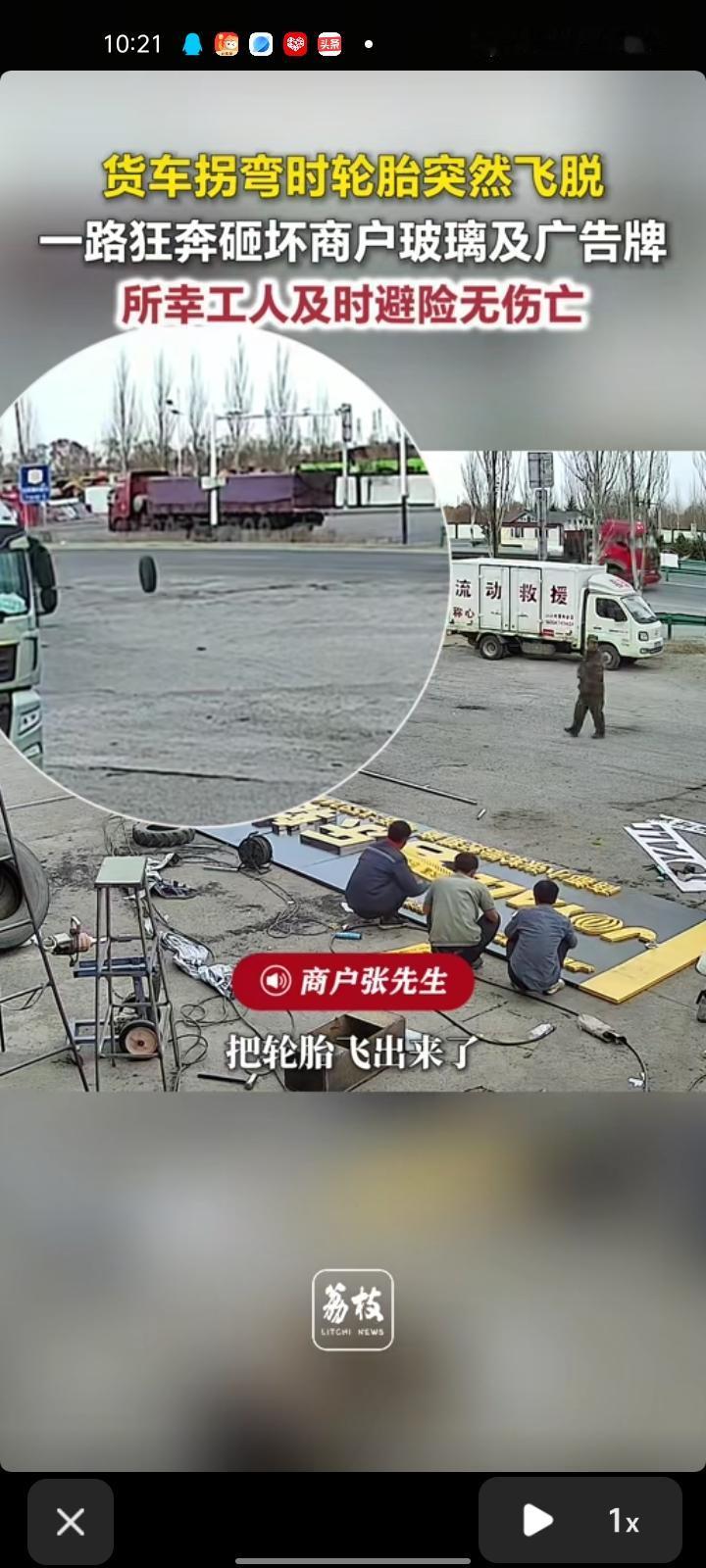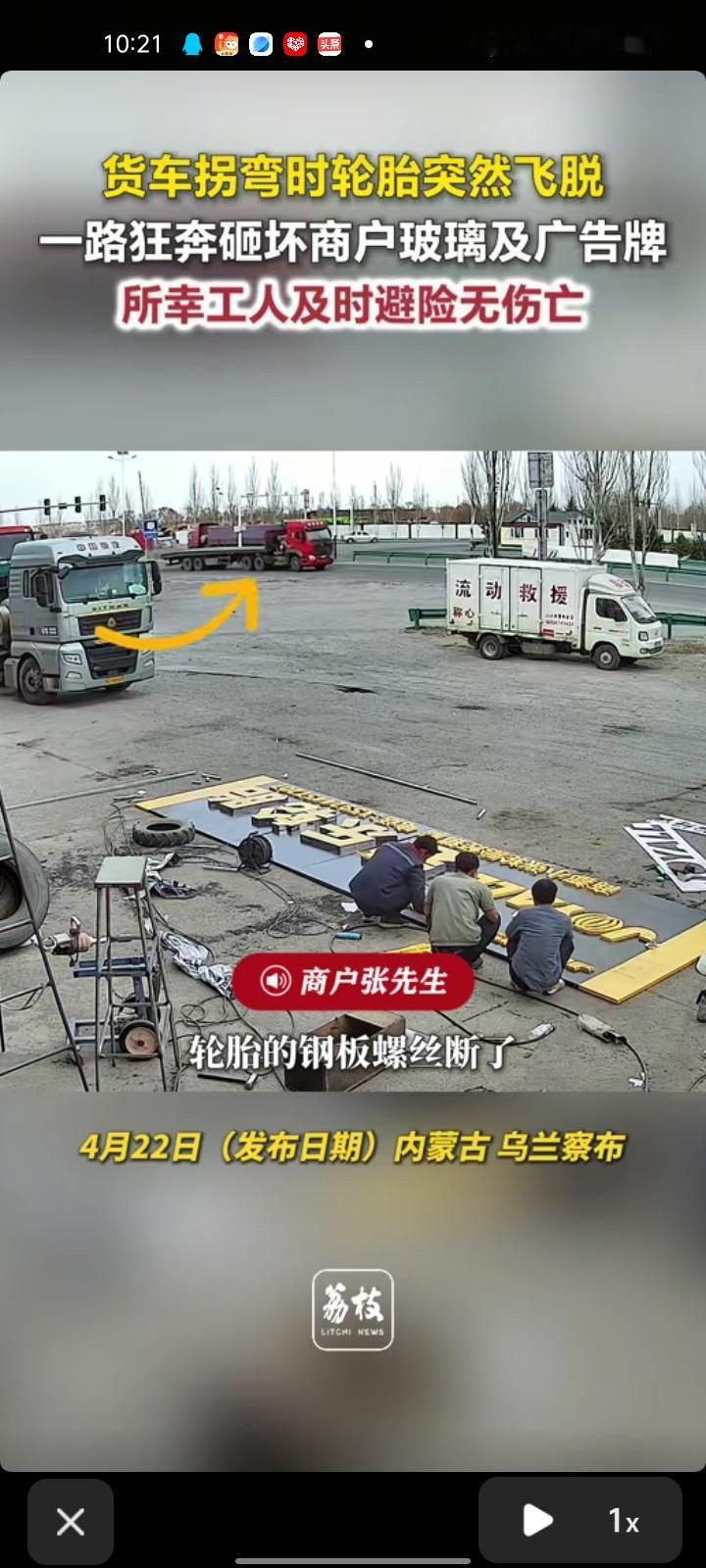 4月17日,乌兰察布市商都县。工人们在制作广告牌时,一辆货车转弯时轮胎突然掉落,他们看到后迅速跑开。