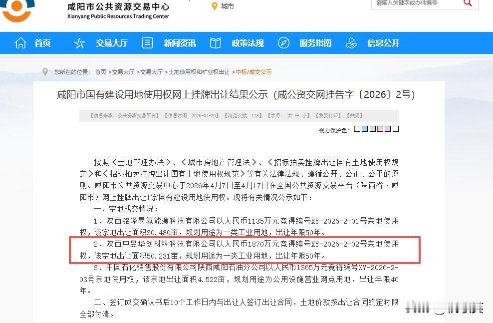 其中,陕西中昱华创材料科技有限公司以人民币1870万元竞得编号XY-2026-2-02号宗地使用权,该宗地出让面积50.231亩,规划用途为一类工业用地,出让年限50年。