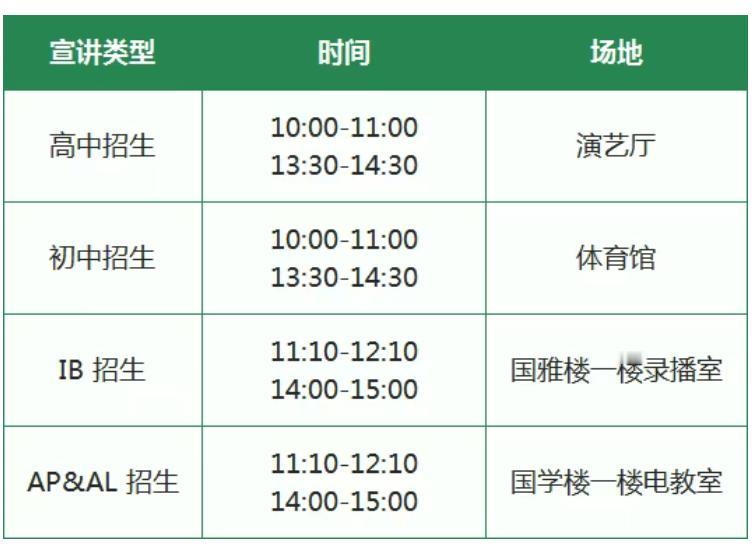 本次推介会设置高中、初中、IB、AP&AL四大专场宣讲,分时段、分场地精准解读招生政策,覆盖多元升学路径,满足不同需求。
