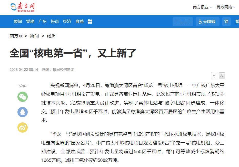 有人问,广东为啥能当“核电第一省”?不是吹的,截至2025年底,广东在运、在建的核电规模都是全国第一,还有完整的核电产业链,从设计、造设备到建设、运营,啥都有,相当于全省都有“电力粮仓”。