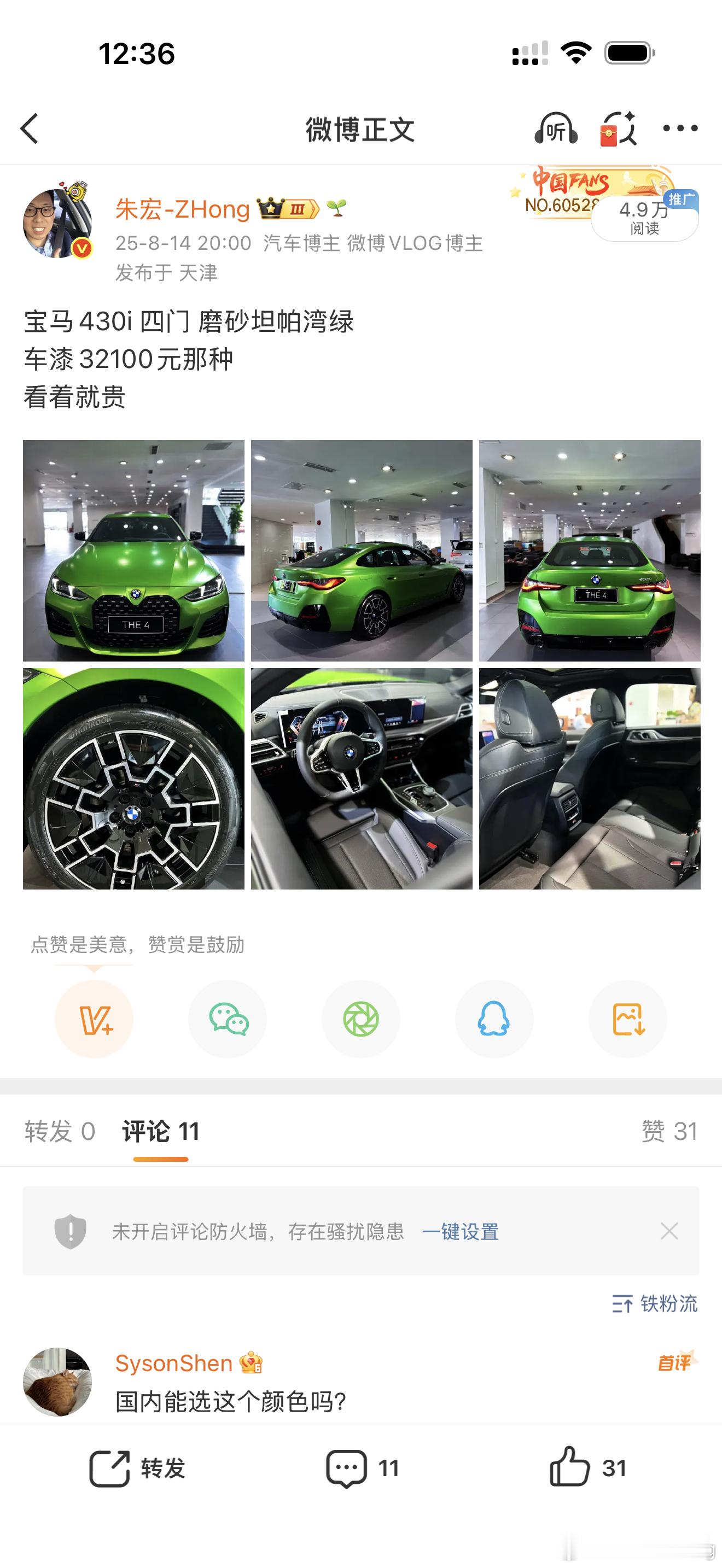 宝马430i 四门 磨砂坦帕湾绿 黑内 这台车还在 指导价426900元选装 车