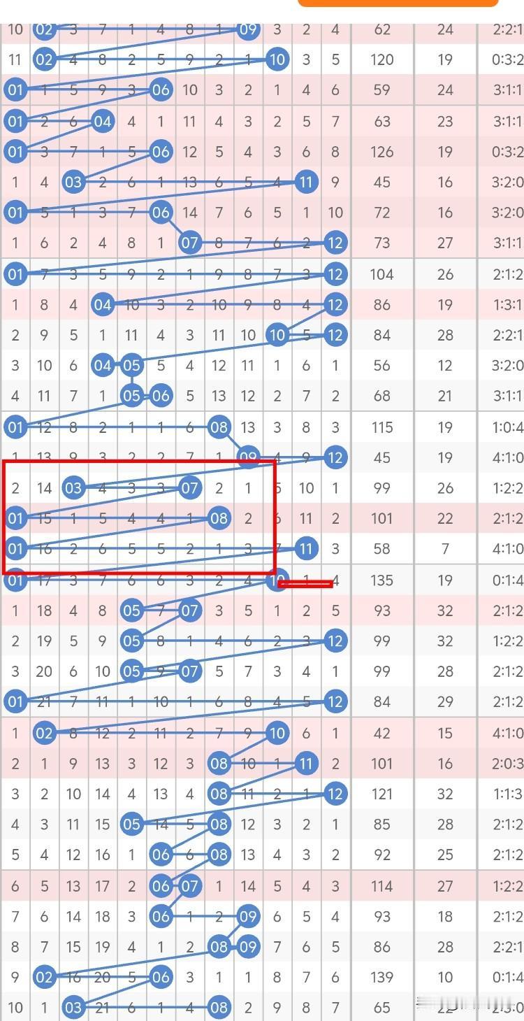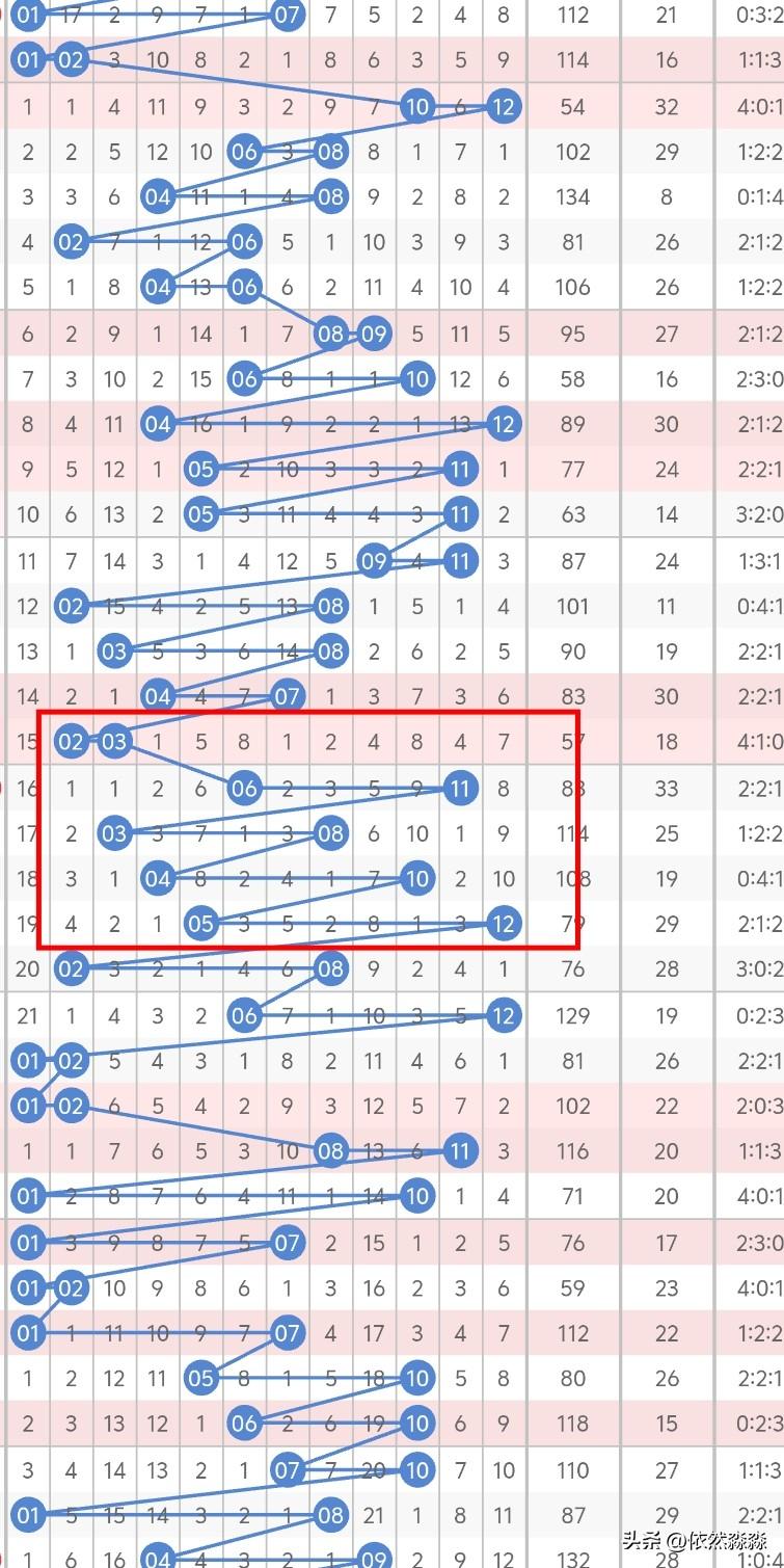 今晚大乐透后区考虑奇偶或偶奇,没有考虑双奇是因为第二位号码,三奇后,转为2双,除非继续双码,下期才会转为单码,上期03、08重落一码的可能很大,如果重落08则考虑01、08,因为冷码只有01和04,而04和上2期02、03正好是斜三连码,05、10、11、12都在向冷码回补,近期内06、07、08、09属高热,而02开码的机率不大,01和10这2码开出的机率都很高,首先要排除不重号,还是考虑01、04、08、10。