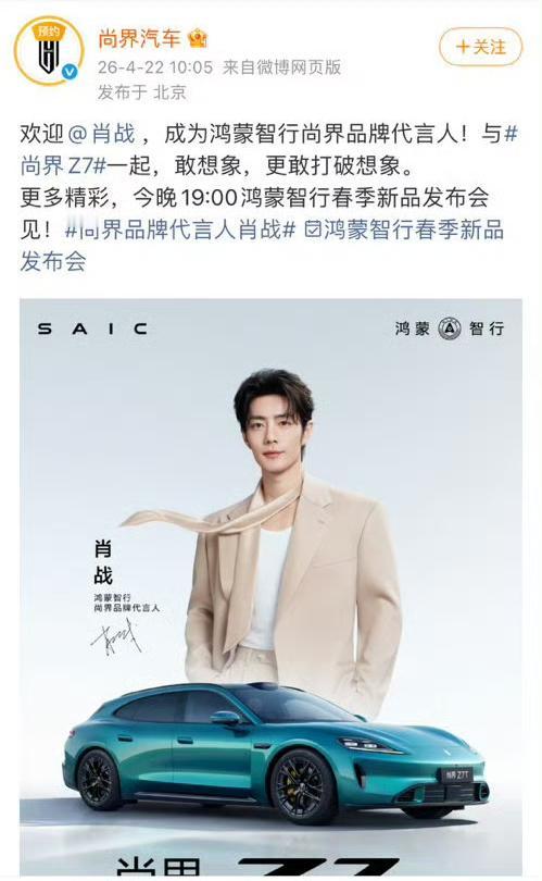 看样子传言成真,尚界即将官宣肖战作为Z7代言人。鸿蒙智行的享界是杨幂,智界是刘亦