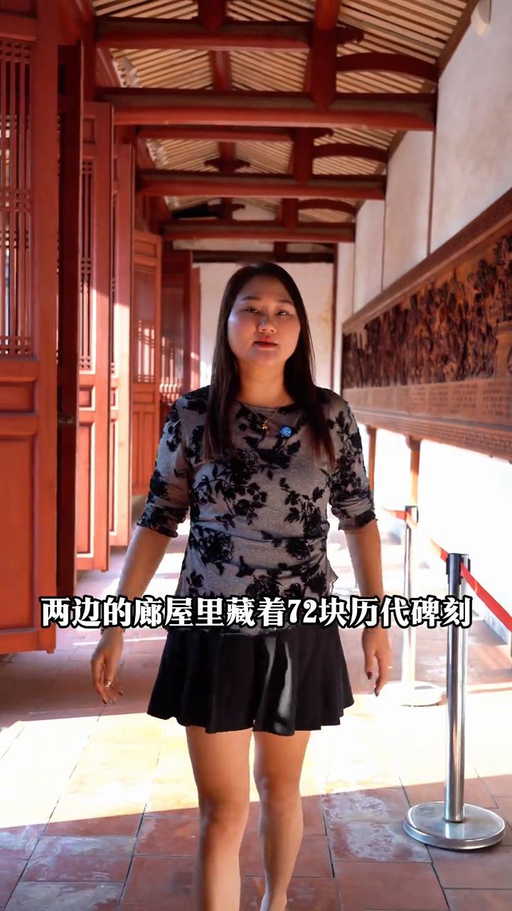 走到东边这个小池子,这个池子叫做"墨池"。别看它小,传说以前学生们天天在这边洗笔,硬是把一池水都染黑了,这就是古人说的"只要功夫深"。而这个"明伦堂"就是当时的教室。最有意思的是,两边的廊屋里藏着72块历代碑刻,那不是冰冷冷的石头,那是古代学霸们的朋友圈和光荣榜。