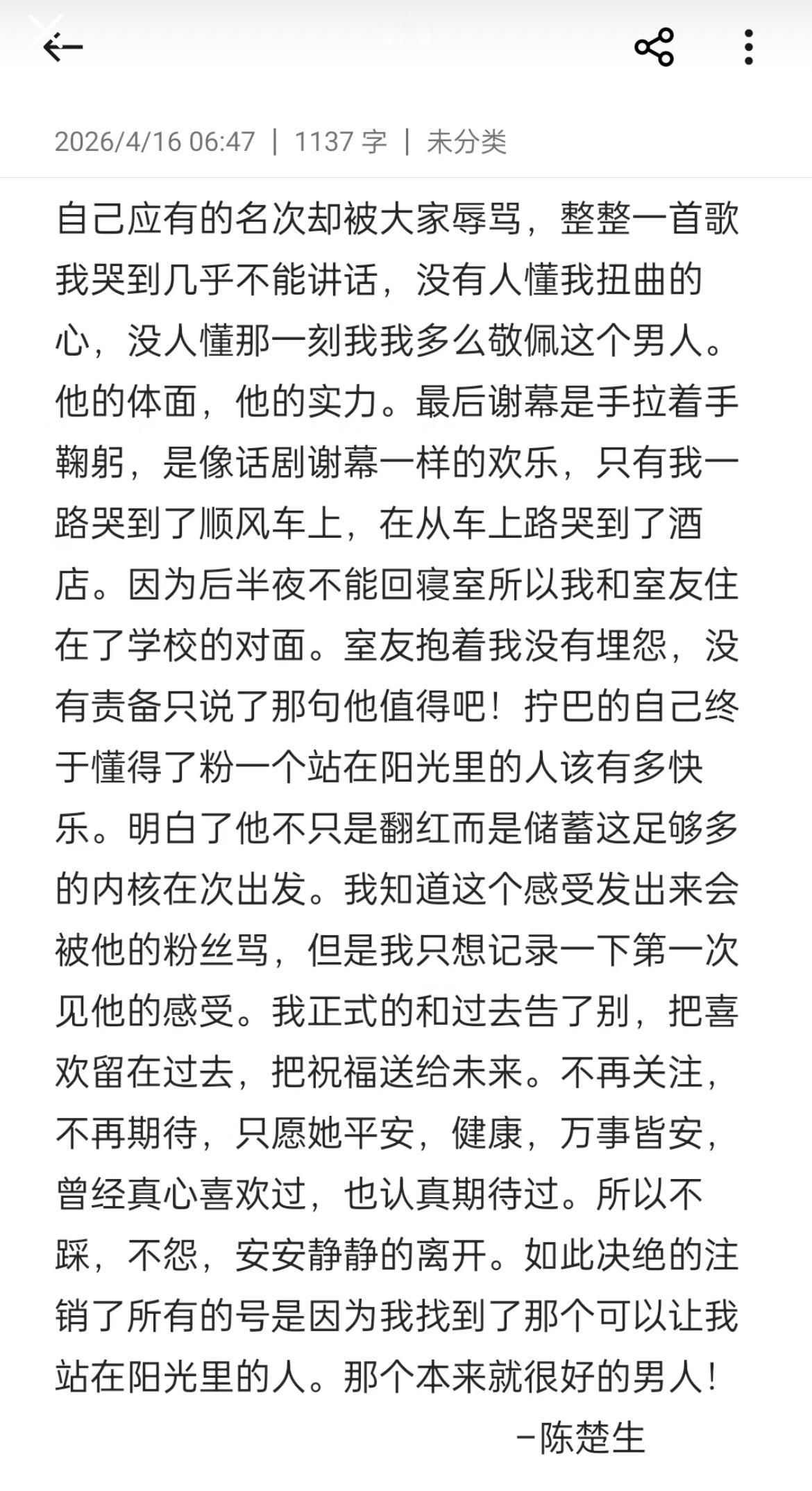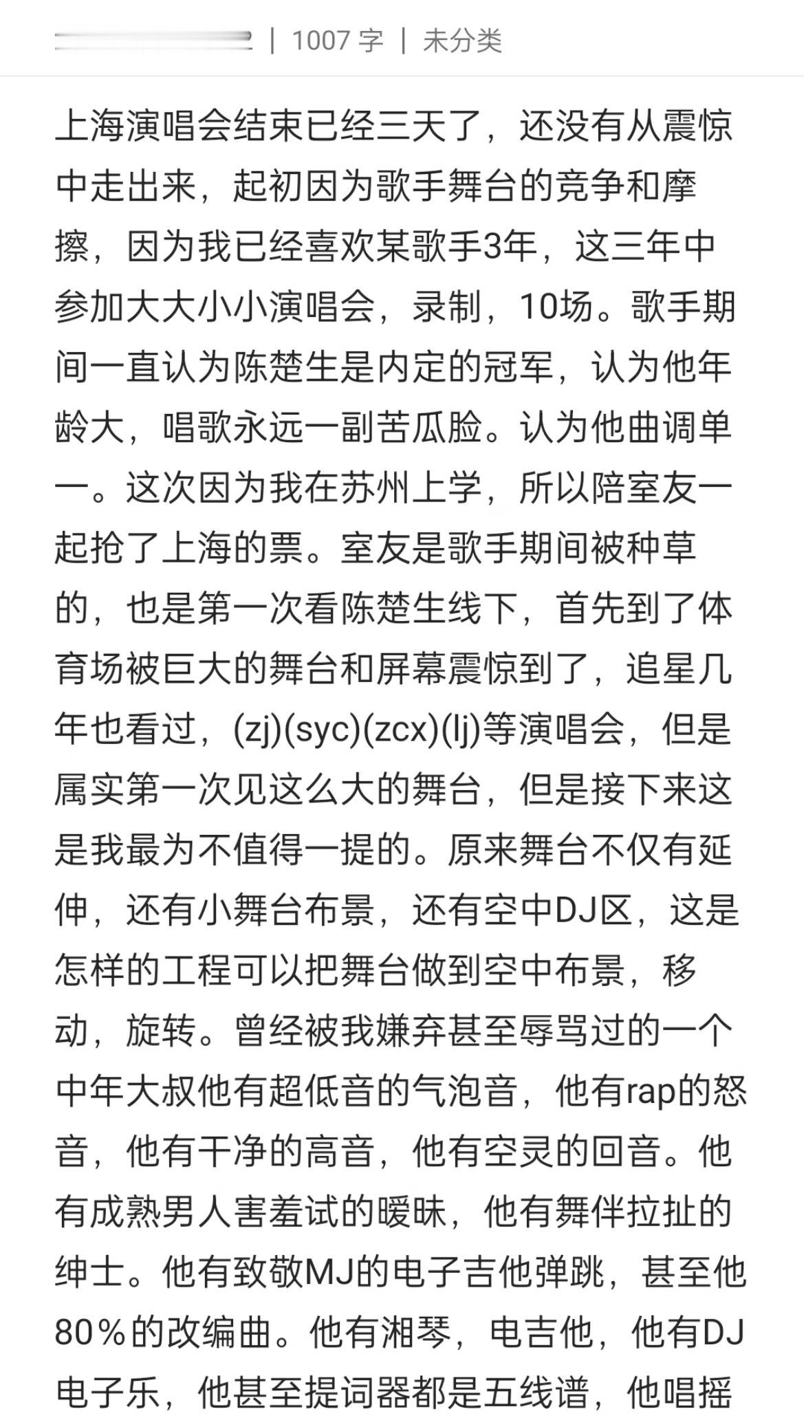 🧱半夜三点写的千字长文——在陈楚生演唱会黑转粉 陈楚生的演唱会不仅可以让粉丝感到满足幸福,让路人觉得惊喜赞叹,还可以凭三个小时尽心尽力打造的舞台让嘿粉打破偏见、重新做人。所有作者的🆔已🐴,无论如何以陈楚生的线下实力和体育场的体量来说,在现场黑转粉的绝对不止发出来的这一个,起码她有勇气去面对自己因为偏见做出的错误判断和行为并道歉。如果有更多因为莫须有的罪名对陈楚生有误解的路人甚至黑粉愿意去现场听一次,感受真正用巨额金钱、时间精力和真诚的心打造的荒芜之境,那我觉得也并不是一件坏事。伤害已经造成了,这是无法逆转和改变的,我也没有资格替受害者说原谅还是不原谅。三个月的黑水和先入为主的跟风ru🐴,陈楚生从来没有出言为自己辩解过,他把砸向他的恶意变成了打造顶尖舞台的野心。事实证明,他有这个实力,陈楚生配得上他所得的一切荣誉。去一次现场,认认真真不带偏见地、就坐在那简简单单地听他唱一首歌,你也许会有不同的感想,柳暗花明又一村,你也许也会在荒芜之境看见繁花盛开 正如陈楚生自己在歌手第四期《凡人诀》舞台后所写的那样:“人生缓缓,自有答案。”