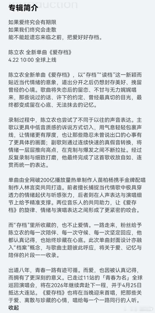陈立农单曲爱存档 陈立农的独特嗓音配上《爱存档》这首歌,把那种想留留不住的思念唱得太到位了。4月25日大连站首唱,期待农农的现场演绎。