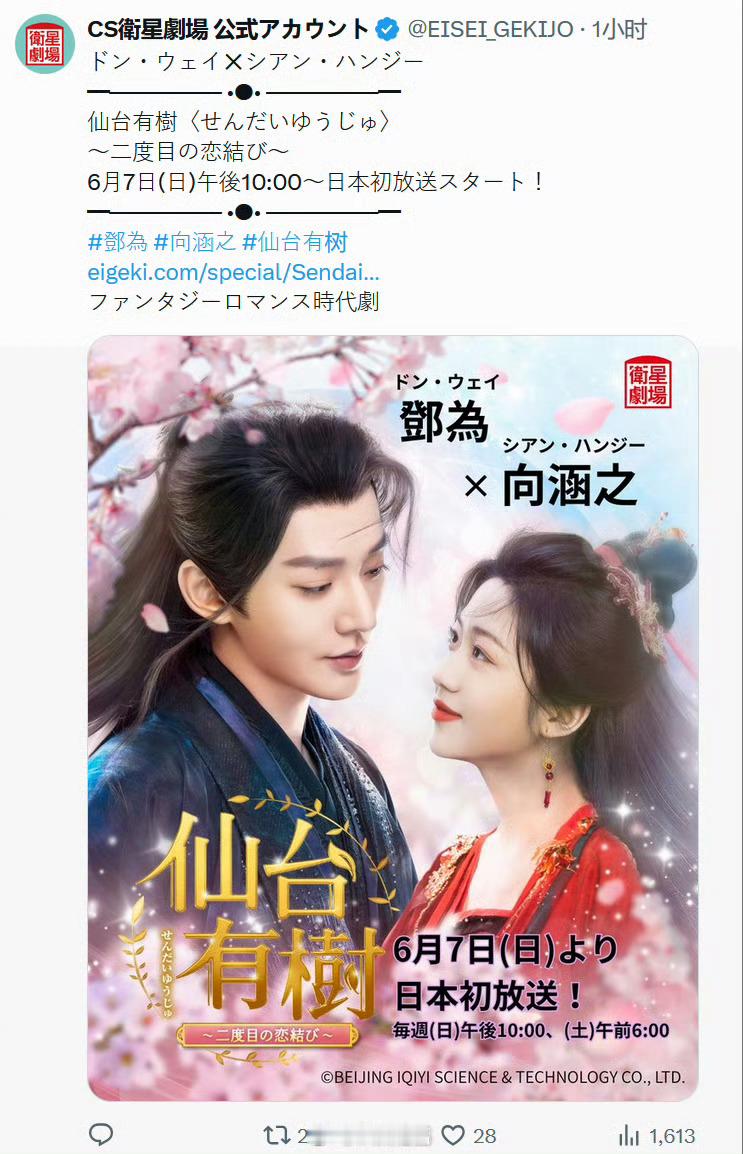 邓为《仙台有树》将于6月7日起在日本卫星剧场播出