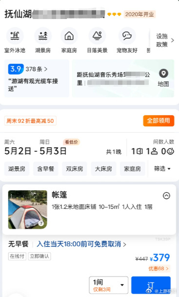 #华晨宇演唱会附近酒店推高价帐篷房#【抚仙湖一酒店“五一”期间推出近400元/晚“普通帐篷房”,回应:帐篷不合格已下架】#抚仙湖近400元帐篷房已下架#“五一”假期将至,国内旅游市场热度持续攀升,有网友反映“五一”期间云南玉溪抚仙湖景区将举行华晨宇演唱会,附近两家酒店临时推出“普通帐篷房”,价格逼近400元一晚引来网友吐槽。4月22日,上游新闻(报料邮箱baoliaosy汤皓)