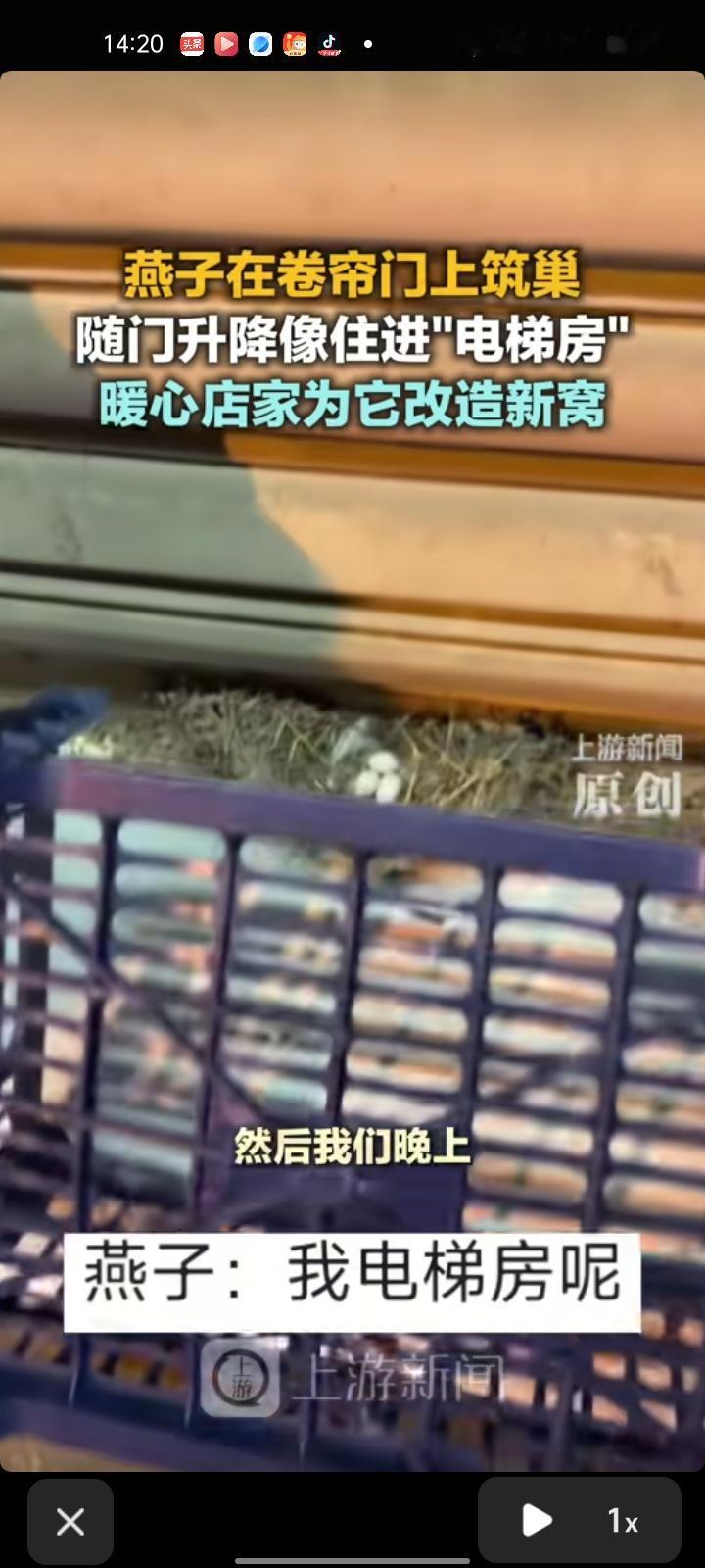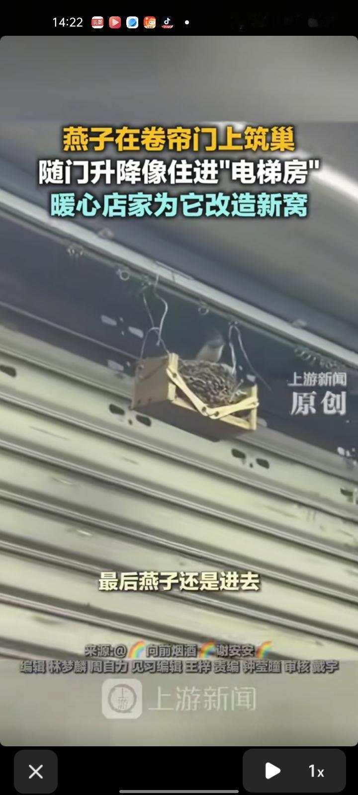 4月22日,四川成都。网友发视频称,一只燕子在卷帘门上筑巢,随门升降像住进“电梯