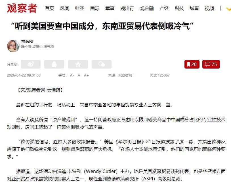 据美国《华尔街日报》4月21日报道:东南亚各国的贸易从业者聚在一起聊天,聊得正热闹,有人一提美国要搞“原产地规则”——说白了就是特朗普政府要查输美商品里的中国成分,超了比例就不让卖、多收税,一屋子人集体倒吸一口冷气,瞬间就安静了。