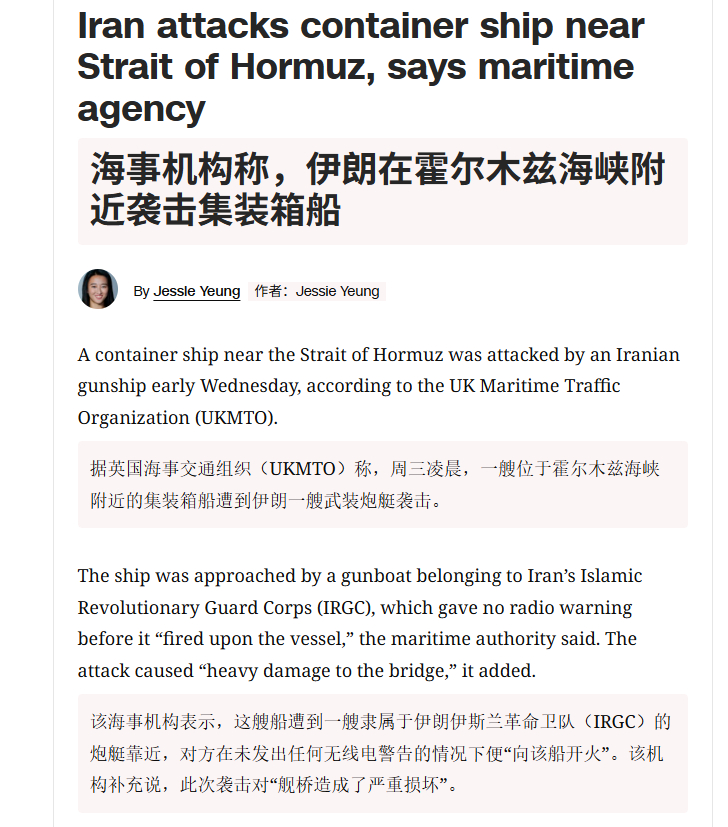 🔻据英国海事交通组织(UKMTO)称,周三凌晨,一艘位于霍尔木兹海峡附近的集装箱船遭到伊朗一艘武装炮艇袭击。🔻据报道,船员安全,无火灾发生,也未造成环境影响。报告未提供该船的更多细节,例如其船旗国或当前位置。🔻又是被诈骗的吗?伊朗抓住了美国的要害美伊停火期限将至伊朗展示导弹海外新鲜事中东现场直击