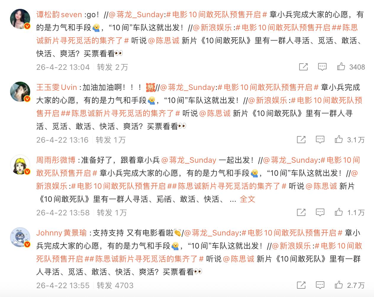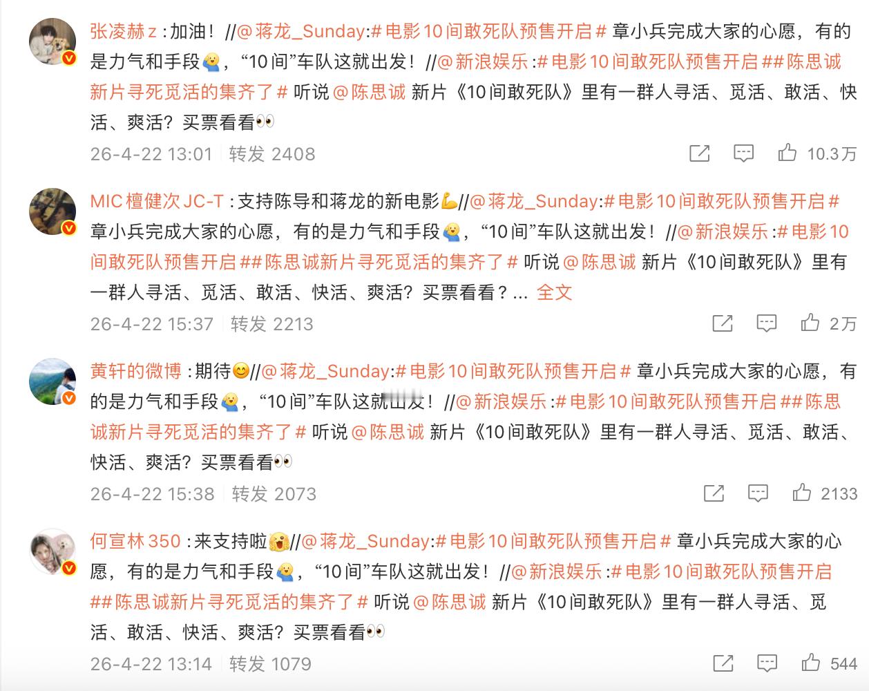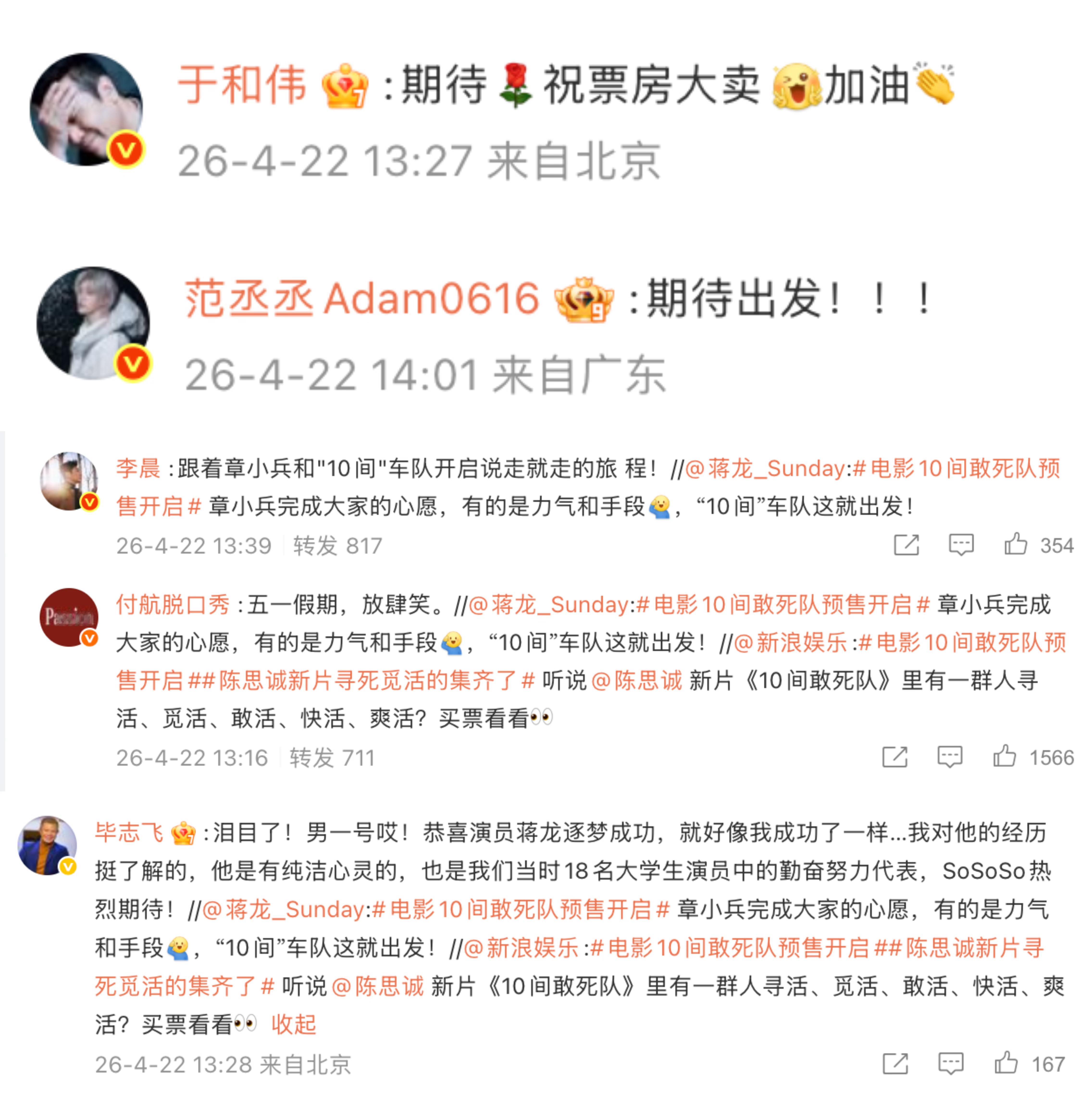 电影10间敢死队预售开启五一档电影《10间敢死队》今日开启预售,蒋龙逐梦多年攒下的圈内人脉也上线为章小兵打call,还包括《逐梦演艺圈》导演毕志飞。张凌赫谭松韵王玉雯打call蒋龙新电影