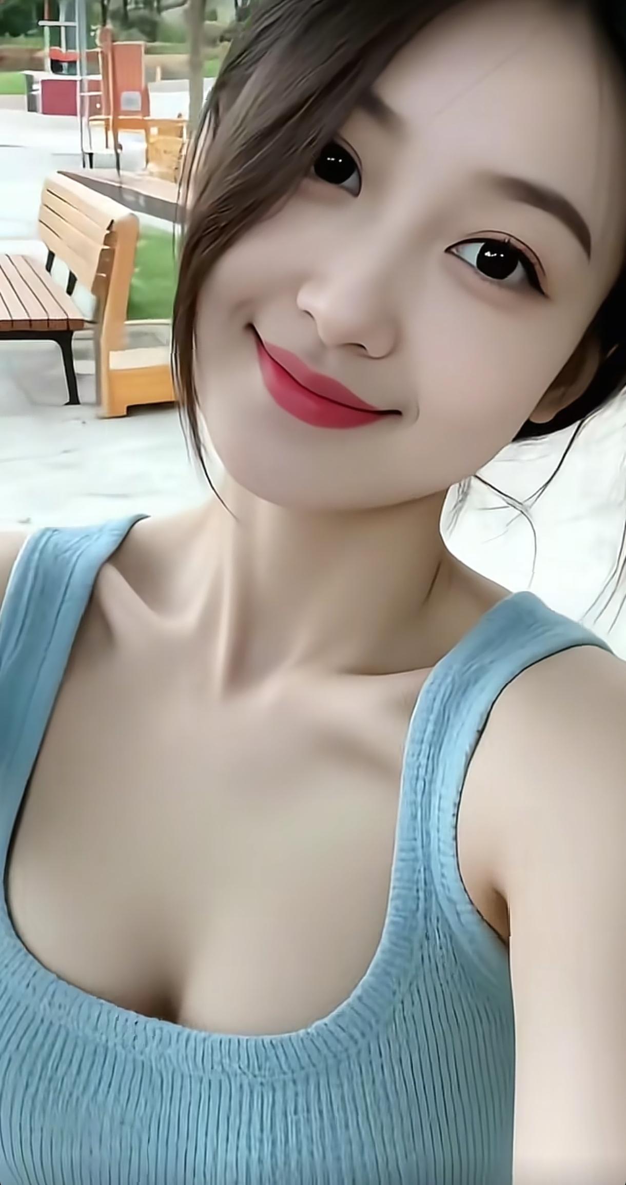 夏日清新穿搭,蓝色背心搭配自然妆容,公园里的甜美瞬间。手机随手拍原创图片 蓝色背心穿搭