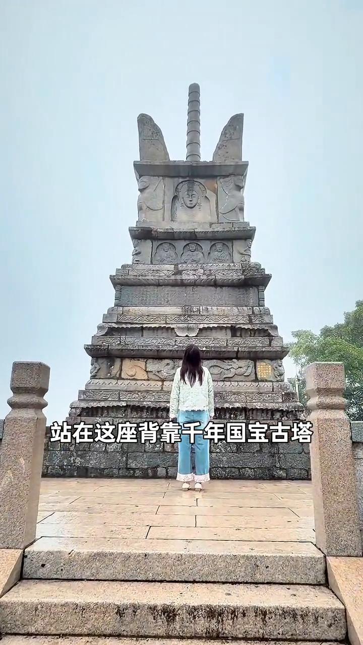 而在宫殿最上方就是这里,站着一座代表中西文化的古塔,而且是全国重点文物保护单位,它就是1100岁的石塔"万寿塔"。它比泉州的东西塔还早了100多年,这不是普通的佛塔,是印度传来的阿育王塔样式。全身刻满了浮雕、双龙戏珠、飞天力士、宝冠菩萨,连塔顶上面的蕉叶上都刻着佛像。当年的波斯商船远远看见它就知道枫亭港到了。