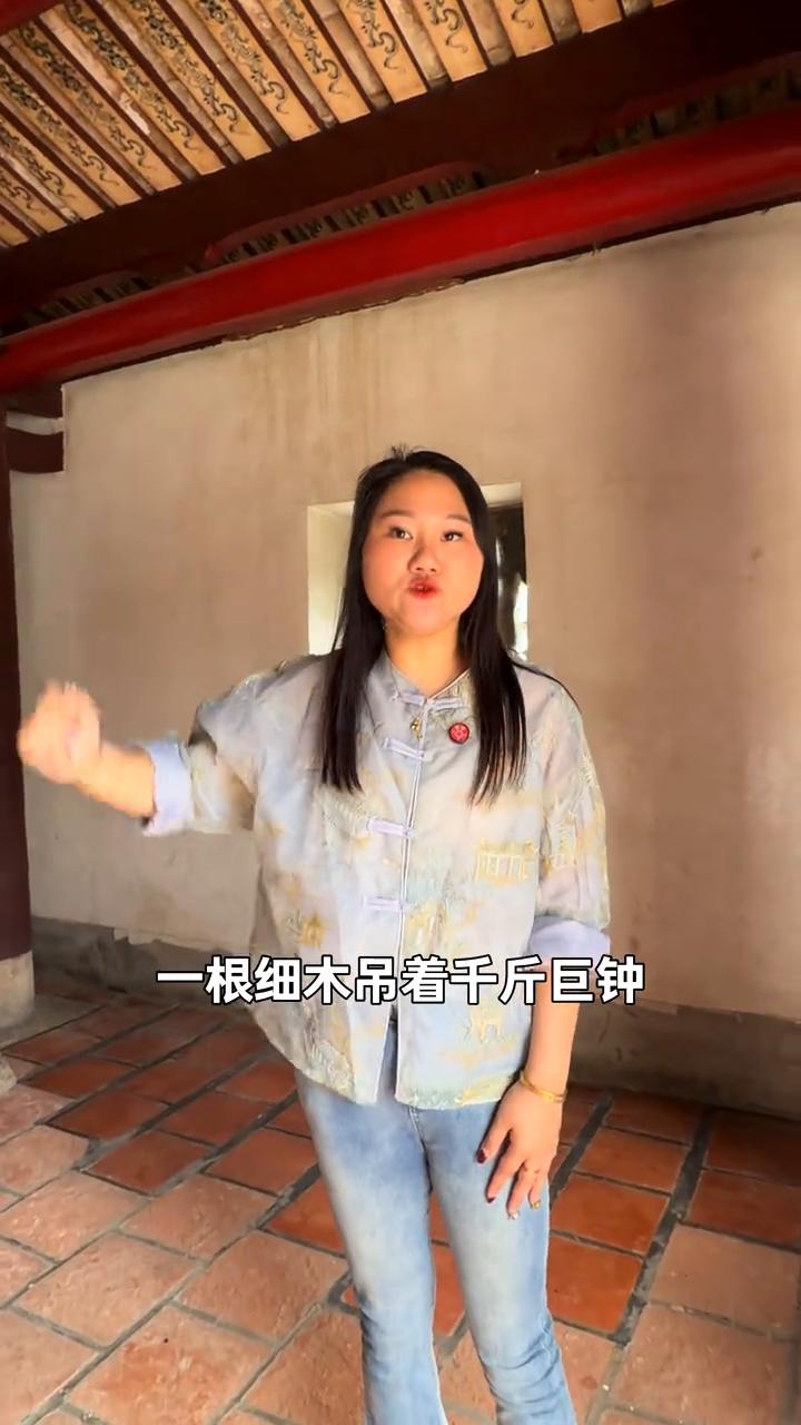 看我头顶这里钟楼有一口千斤重的铜钟,挂住它的横梁,只是一根从南阳运来的显超木,直径只有十四厘米,像手腕那么粗,一根细木吊着千斤巨钟一千多年了,纹丝不动,这到底是怎么做到的?