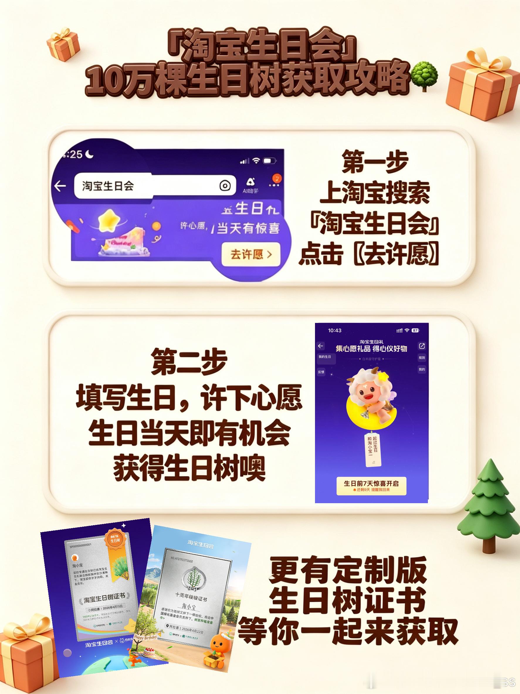 淘宝送你一棵生日树淘宝生日会淘宝生日礼 4月寿星也太幸福了吧!淘宝直接包机酒带去沙漠办生日会,还送10万棵生日树~ 上淘宝搜【淘宝生日会】填心愿,就能get专属生日树和证书,把浪漫种在沙漠里,这波宠爱谁不心动!