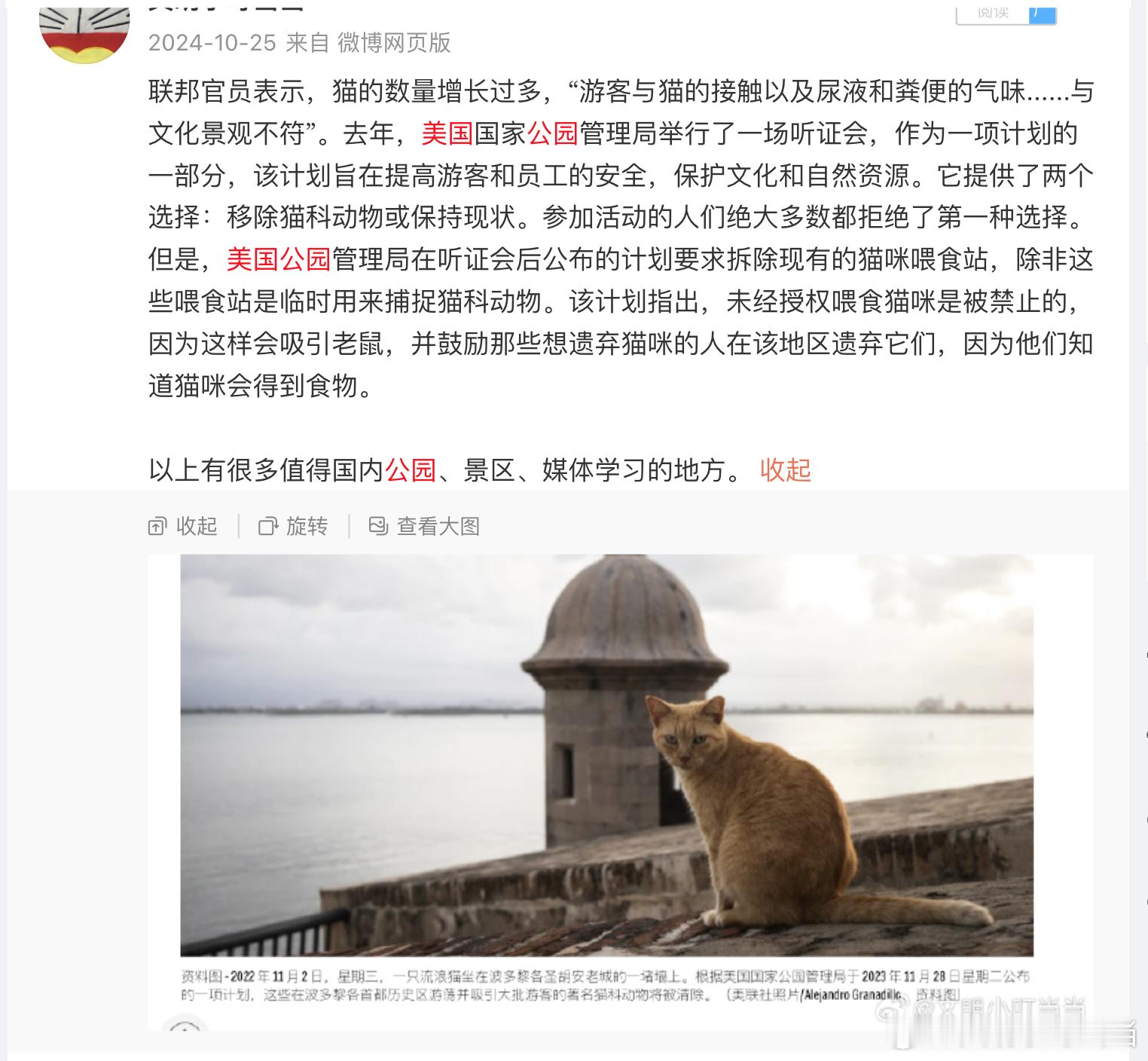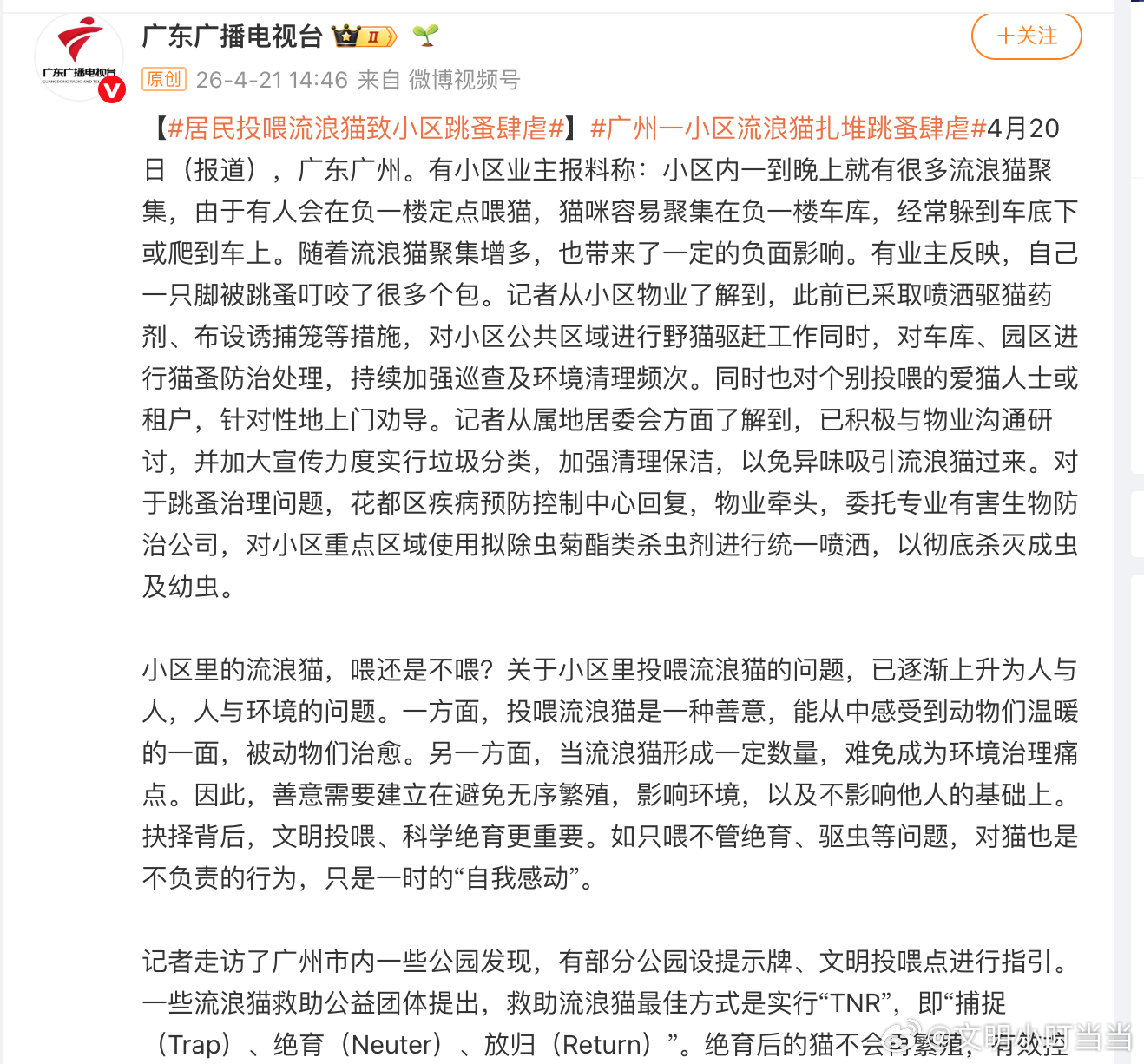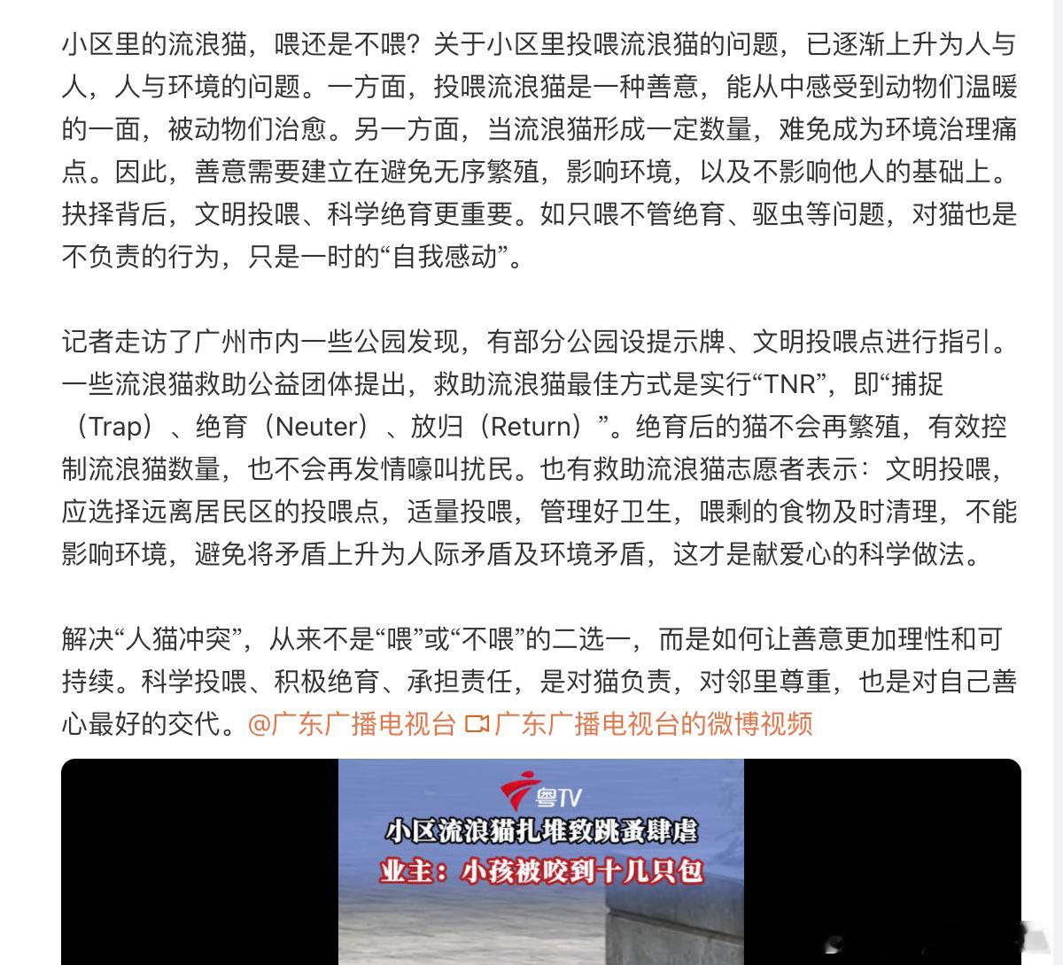 美国的公园力排众异,强力清除掉流浪猫投喂点,多国及地区将投喂视为违法行为。广东电视台何以冒天下之大不韪,将投喂流浪猫这种丑陋行径美化成爱心,tnr的钱从电视台的财政工资里出可还行?还是想骗捐,为宠物医院增收?