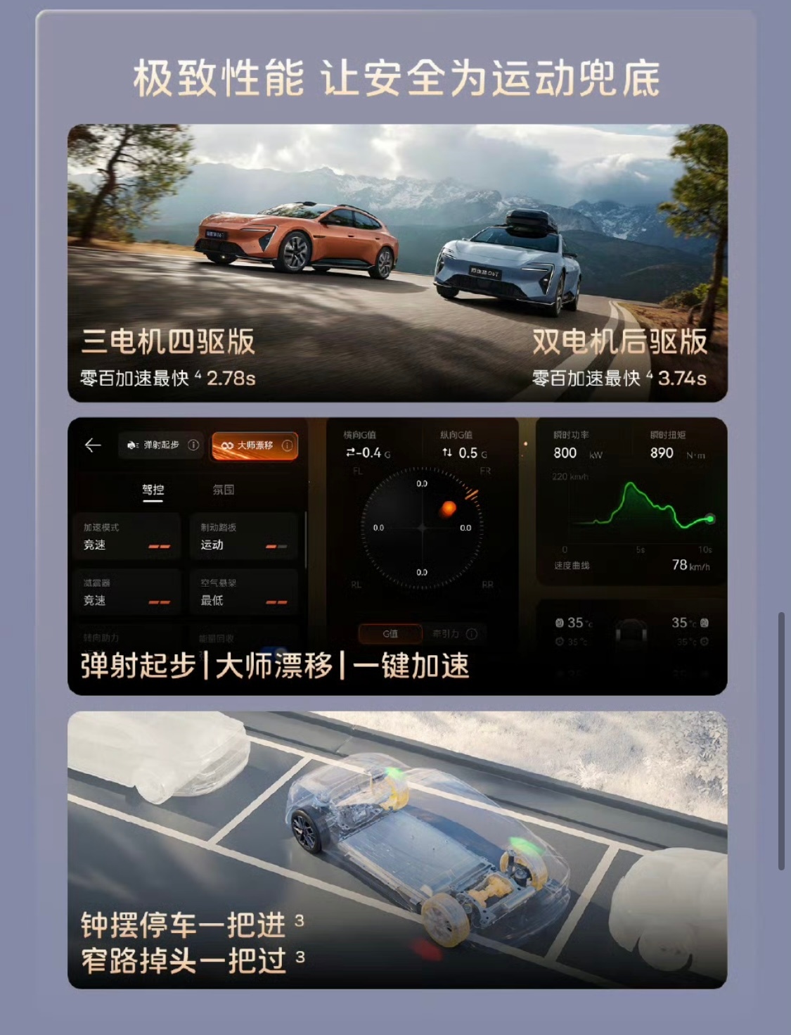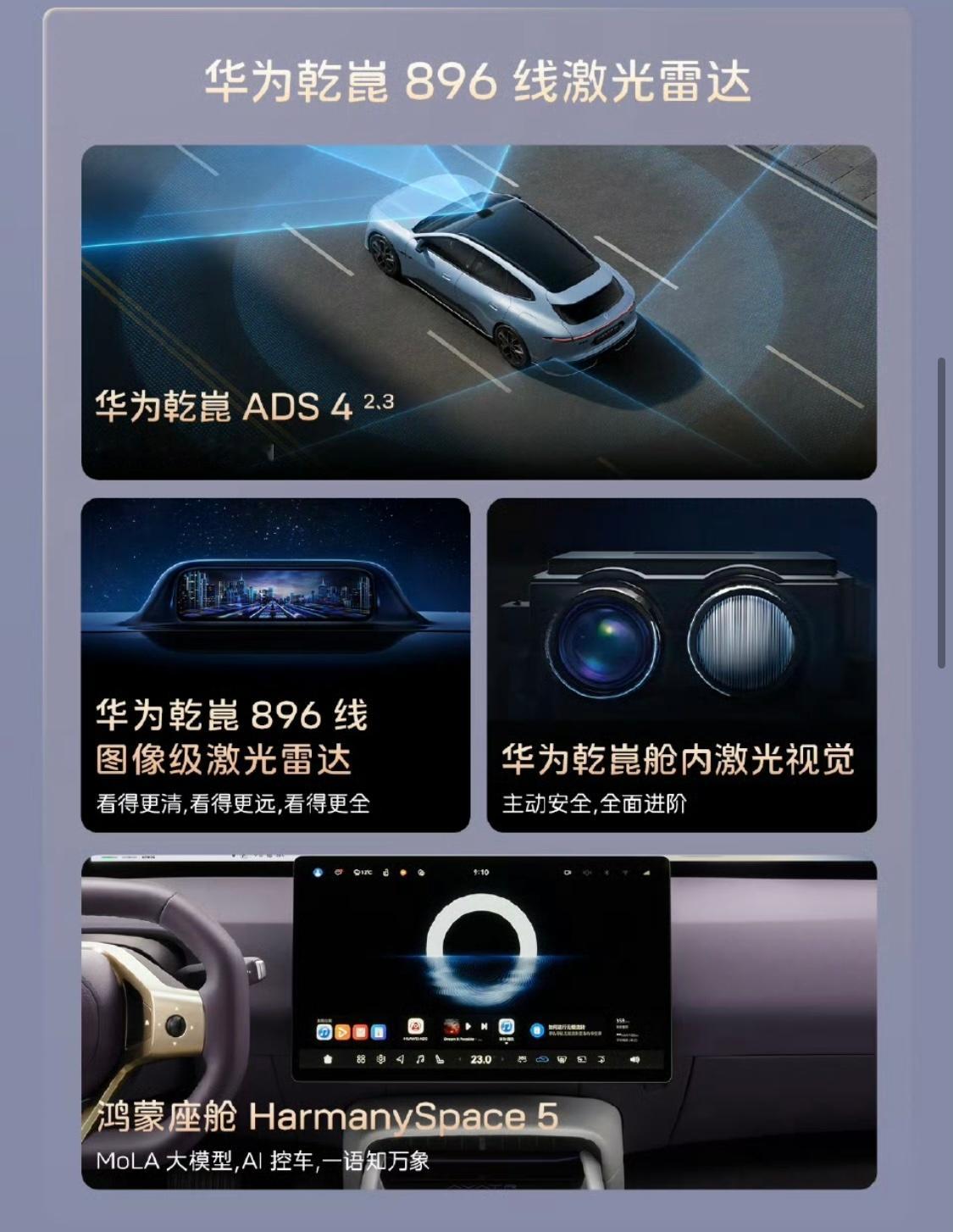 起步就是500多kw的双电机后驱,全系标配华为乾崑ADS 4,Max及以上升级双激光雷达+3颗4D毫米波雷达。动力上Elite续航652km,Max纯电/Max+续航741km,增程版纯电330km/综合1250km,Performance零百2.78秒。底盘Max+及以上配空气悬架+CDC,Performance加四活塞卡钳。全系标配鸿蒙座舱5、16扬声器英国之宝。