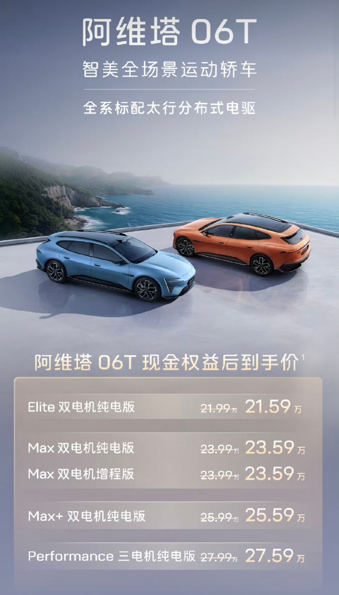 阿维塔06T上市21.99万起阿维塔06T正式价格来了,21.99-27.99万元,共5款:Elite纯电21.99万,Max纯电/增程同价23.99万,Max+纯电25.99万,Performance三电机27.99万。