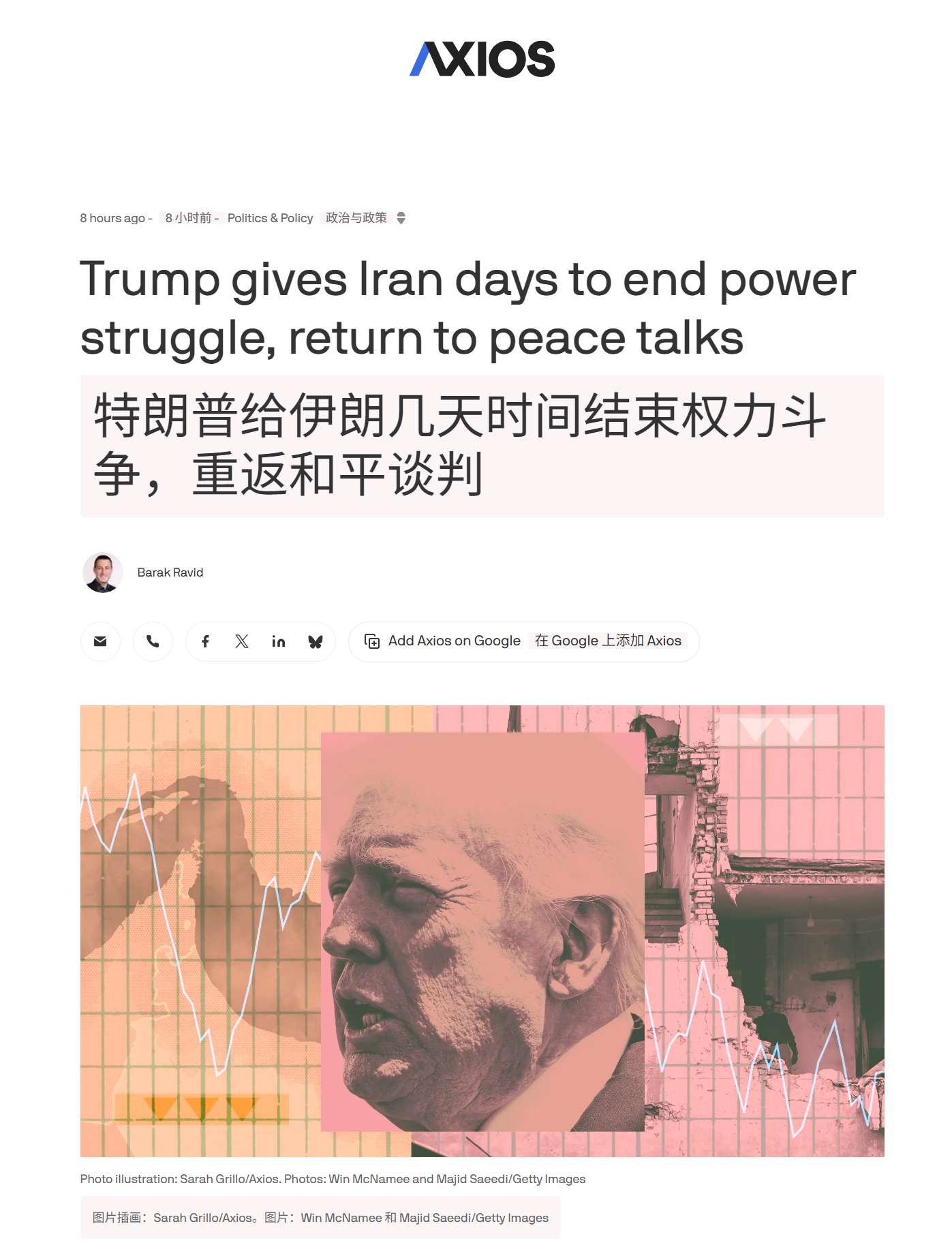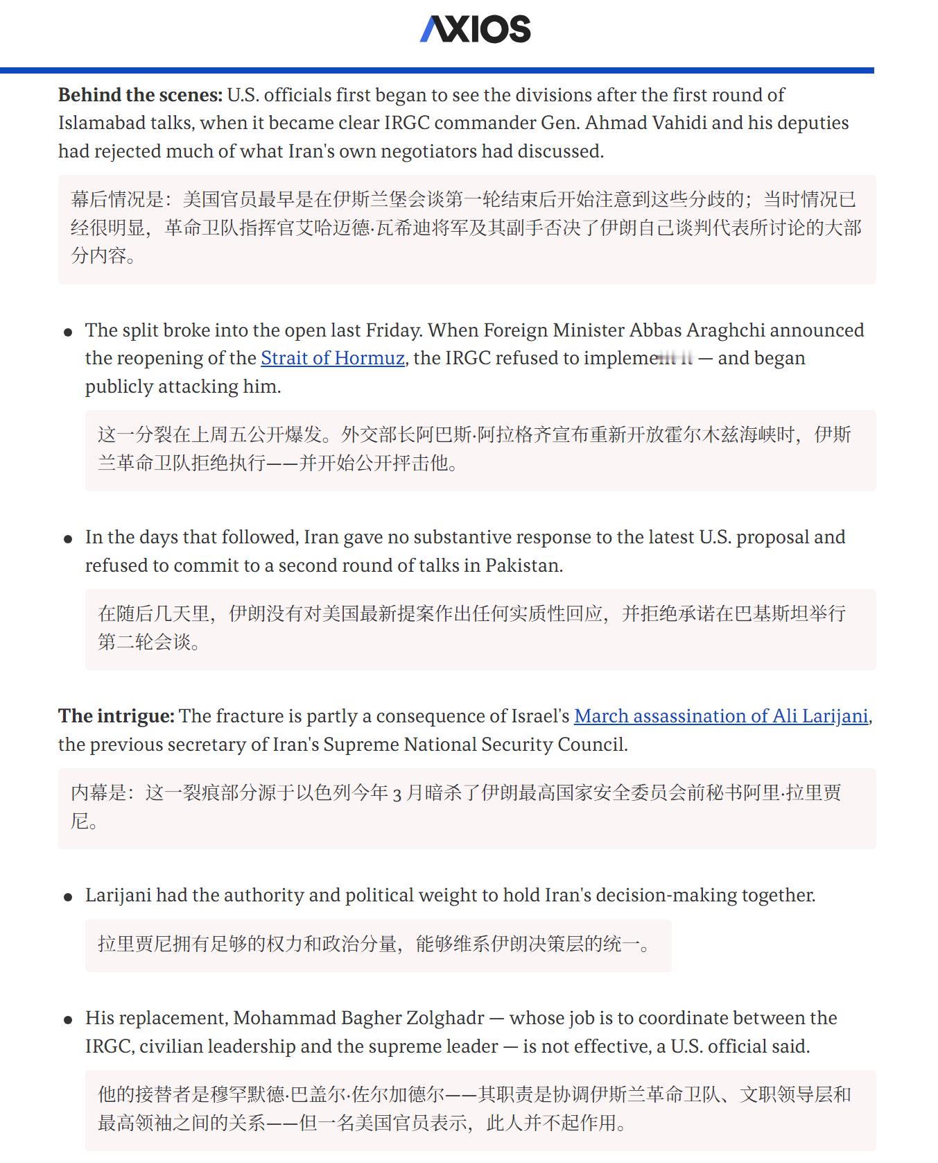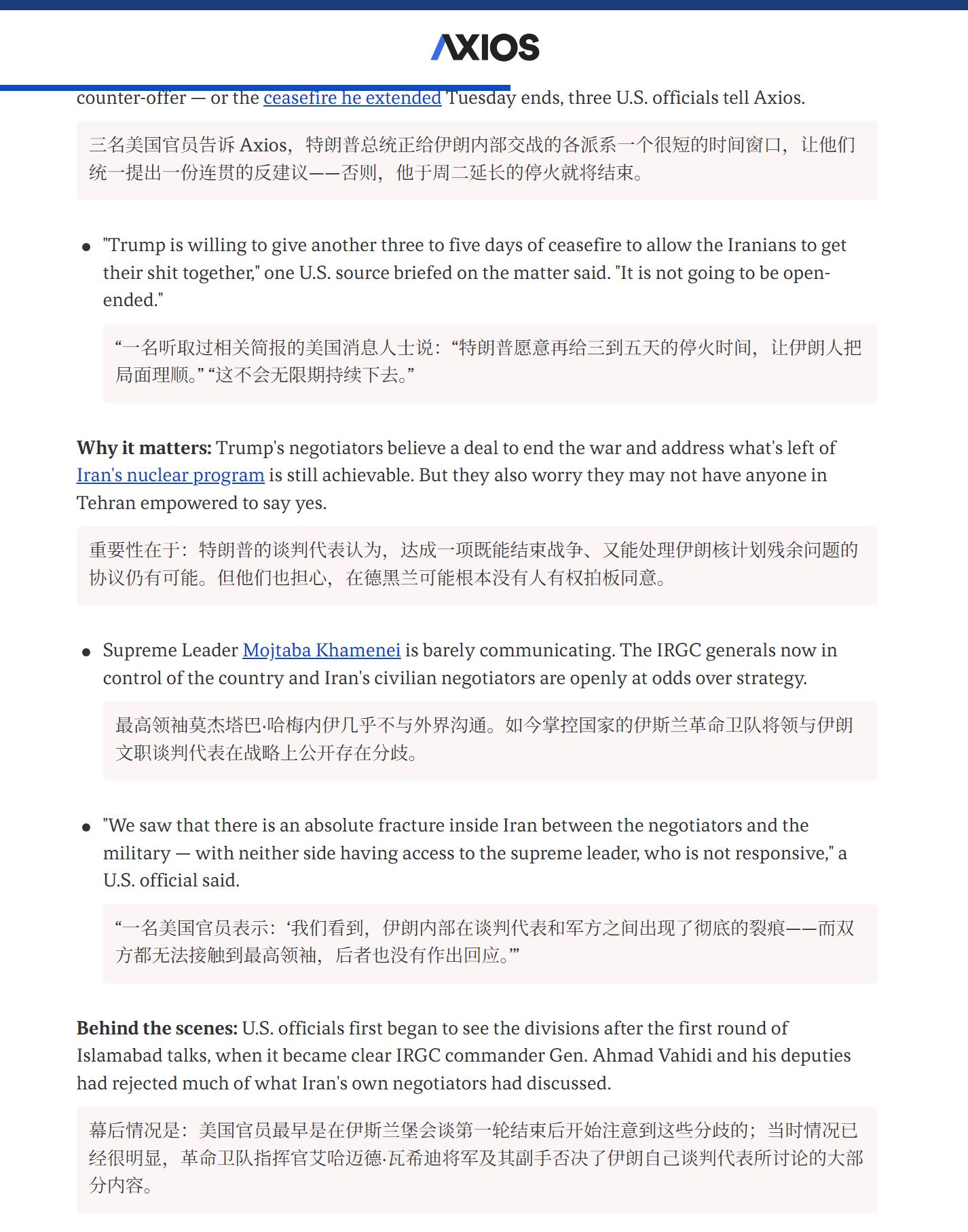 🔻你看 Axios 的这个巴拉克·拉维德说的什么:🔻“特朗普给伊朗几天时间结束权力斗争,重返和平谈判。三名美国官员告诉 Axios,特朗普总统正给伊朗内部交战的各派系一个很短的时间窗口,让他们统一提出一份连贯的反建议——否则,他于周二延长的停火就将结束。一名听取过相关简报的美国消息人士说:‘特朗普愿意再给三到五天的停火时间,让伊朗人把局面理顺。这不会无限期持续下去’。”🔻“最高领袖莫杰塔巴·哈梅内伊几乎不与外界沟通。如今掌控国家的伊斯兰革命卫队将领与伊朗文职谈判代表在战略上公开存在分歧。一名美国官员表示:‘我们看到,伊朗内部在谈判代表和军方之间出现了彻底的裂痕——而双方都无法接触到最高领袖,后者也没有作出回应’。美国官员最早是在伊斯兰堡会谈第一轮结束后开始注意到这些分歧的;当时情况已经很明显,革命卫队指挥官艾哈迈德·瓦希迪将军及其副手否决了伊朗自己谈判代表所讨论的大部分内容。”🔻不知道的还以为巴拉克·拉维德趴在德黑兰某个床底下呢。🔻把伊朗各种贬低一番,最后还是要承认:“过去 48 小时对白宫来说极其令人沮丧——尤其是对副总统万斯而言,当时他已经收拾好行李,准备前往伊斯兰堡主持第二轮和平谈判。他发现自己只能等待如今掌控伊朗局势的革命卫队将领,批准议会议长穆罕默德·巴盖尔·加利巴夫和阿拉格齐前往巴基斯坦与他会面。”🔻所以,什么“伊朗内部不和”、“伊朗消息矛盾”基本都是 Axios 编出来的。🔻但是,你如果把报道中的“伊朗”换成“美国”,“德黑兰”换成“华盛顿”,人名换成特朗普团伙,突然就说的通了。卢拉调侃赶紧给特朗普颁奖受困霍尔木兹船员2万果蔬补给吃20天海外新鲜事中东现场直击