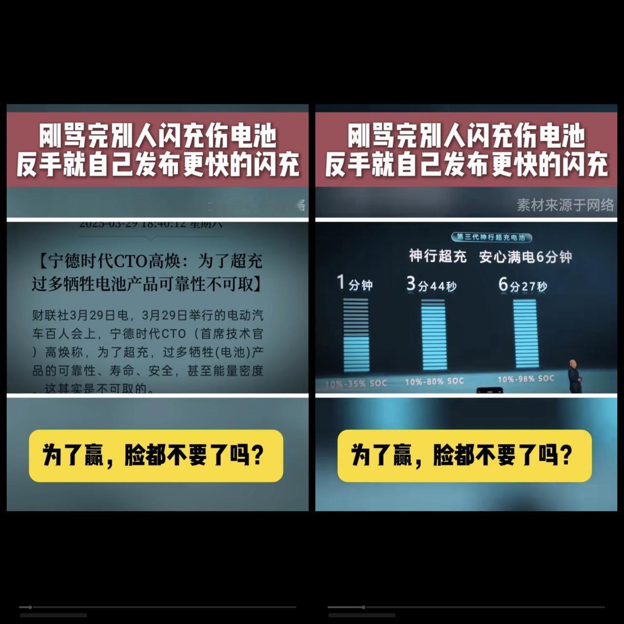 去年3月比亚迪发布了唐L汉L搭配兆瓦闪充技术车型,发布即上市。接着市宁德时代也在去年4月发布二代麒麟神行刀片电池,号称充电五分钟跑500多公里,这么好的技术有哪些车子用了,或者是有量产车型验证了[打脸][打脸][打脸]?上个月比亚迪发布二代刀片电池及1500M瓦闪充技术,也是发布即上市,不是PPT。宁德时代的CEO就喷闪充伤电池,才一个多月,现在宁德时代三代麒麟神行电池又出来了,充电速度还更快[捂脸][捂脸][捂脸],宁德时代就验证三代麒麟神行电池快充就不伤电池了,先把去年发布的二代神行电池技术落地了再说吧,不要再打自己的脸了[打脸][打脸][打脸]