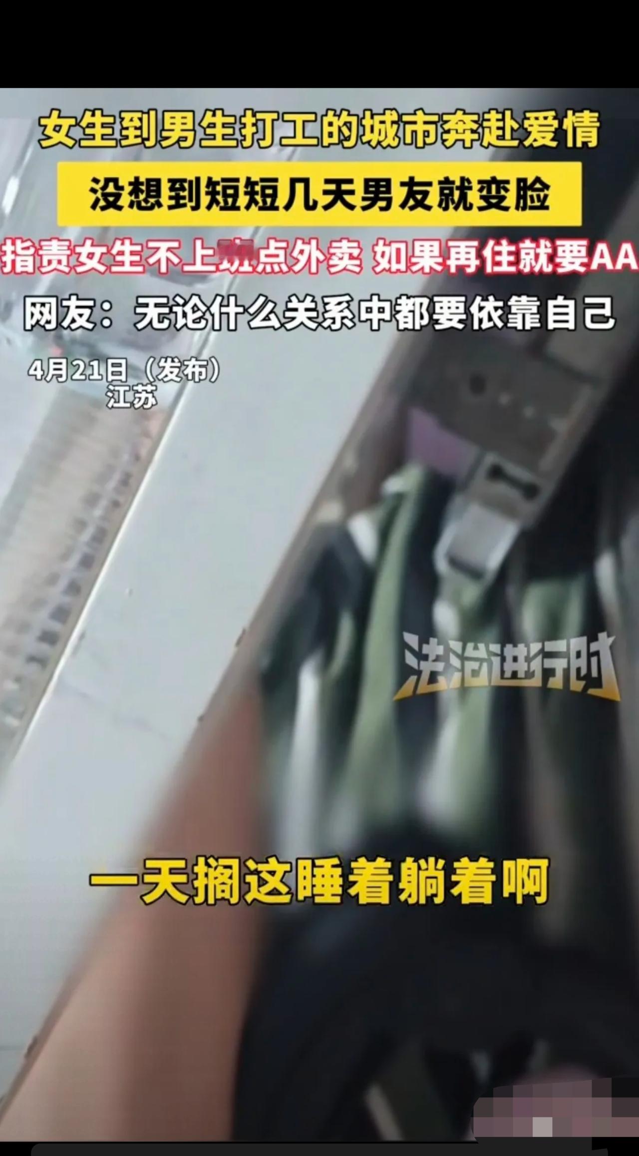 江苏,女子为爱投奔男友打工的城市,住了几天,男友翻脸,怪她不找工作,钱都花没了,