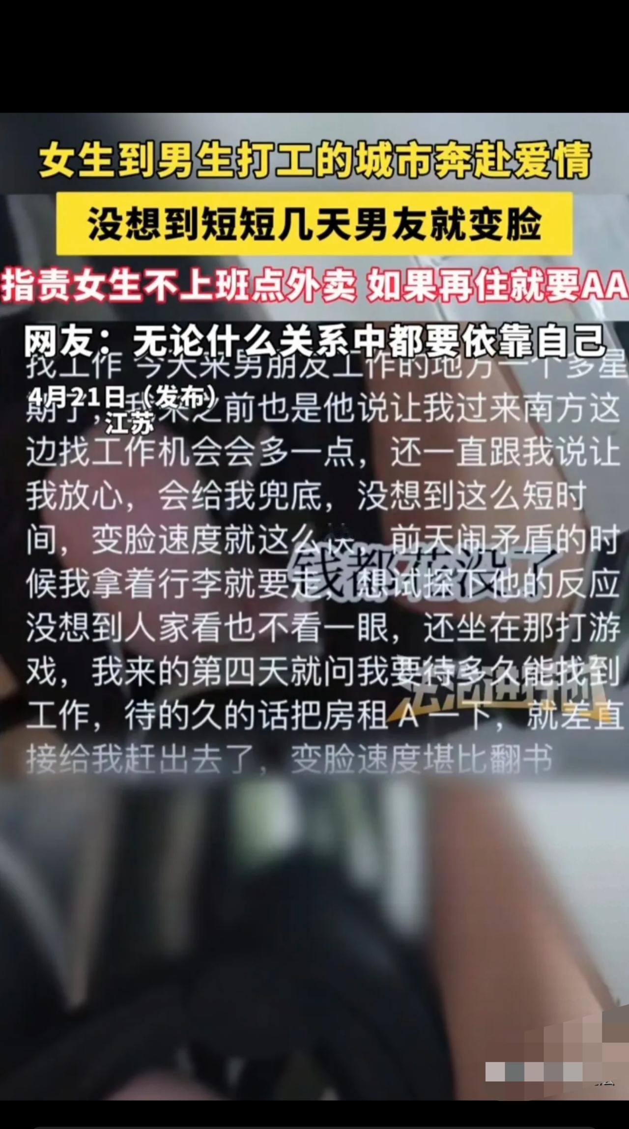 江苏,女子为爱投奔男友打工的城市,住了几天,男友翻脸,怪她不找工作,钱都花没了,还吃他一周的饭钱,如果再住就AA,女子质问男友:一周的饭钱你就受不了了?我每次就吃15块钱的饭。网友:及时止损吧!
