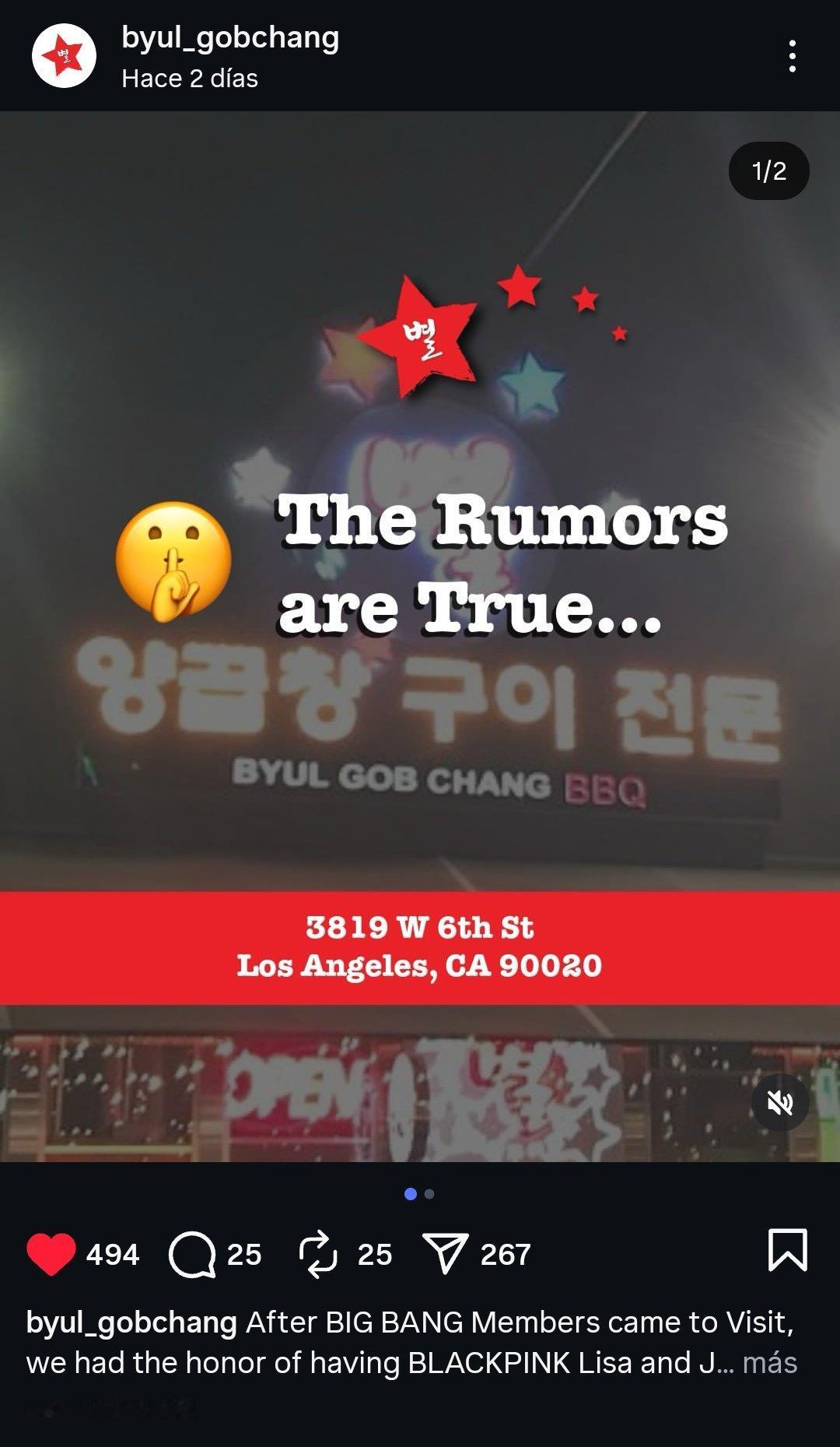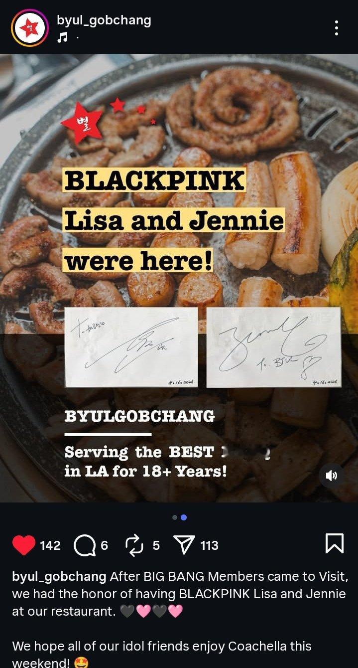 店主:BIGBANG成员们来访之后,我们又在科切拉音乐节周末前,荣幸地迎来了Jennie和Lisa光临我们的小店🌴(店主还意味深长的来了句:是真的)⭐ Byulgobchang 星烤肠 - 地址:3819 W 6th St, Los Ángeles, CA 90020