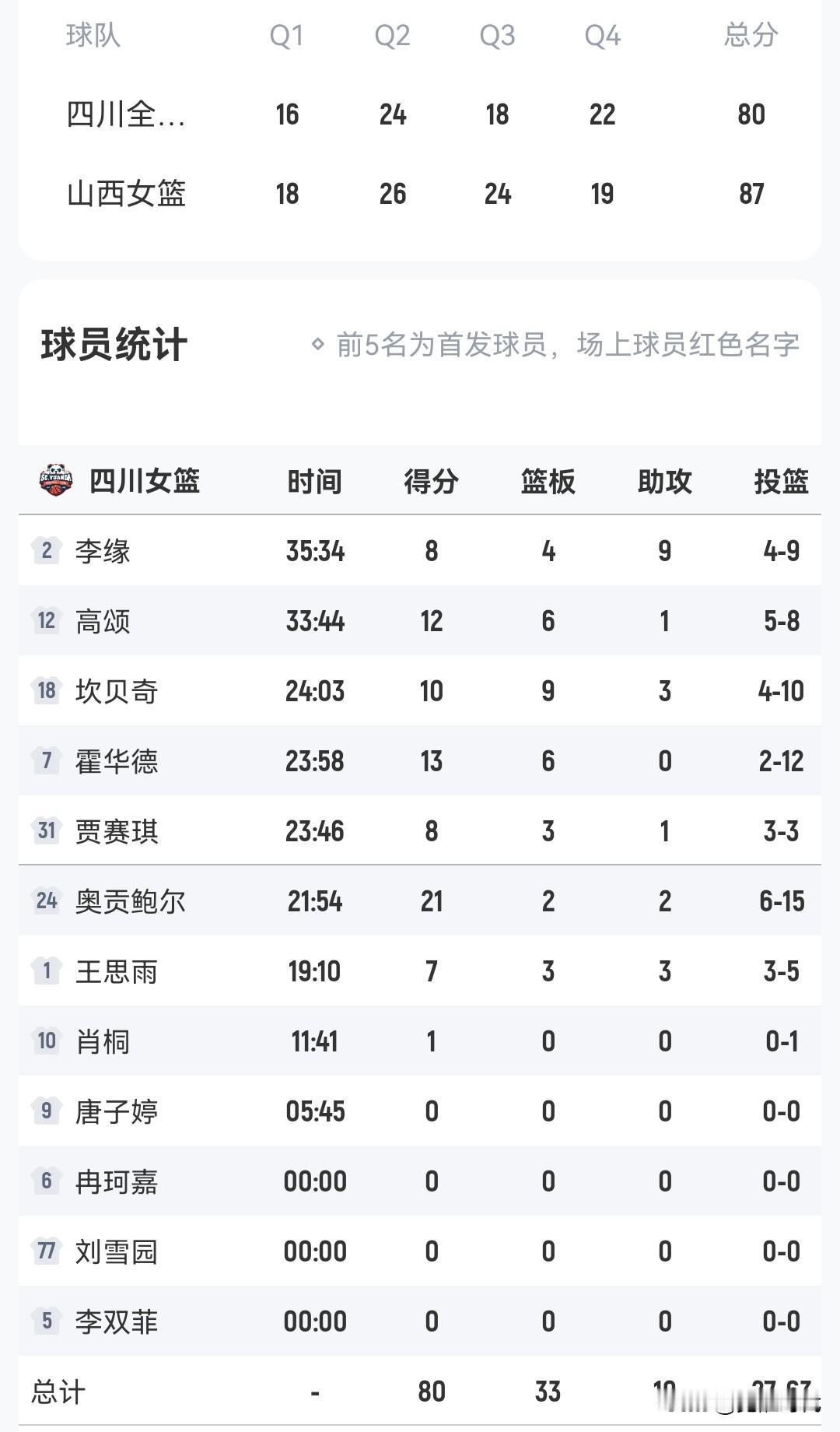 山西女篮87-80四川 大比分2-2平 布朗34+ 李缘8+9助