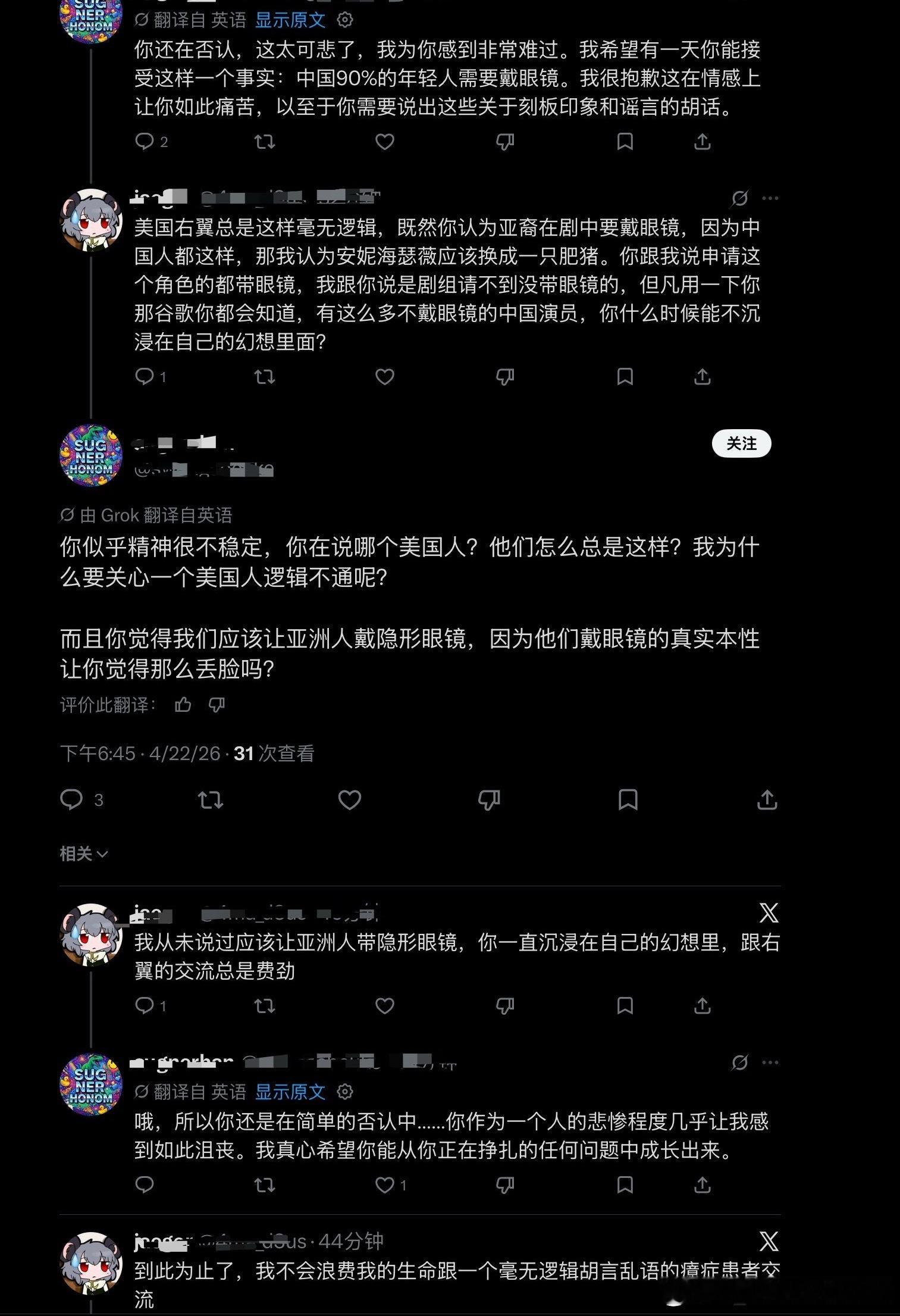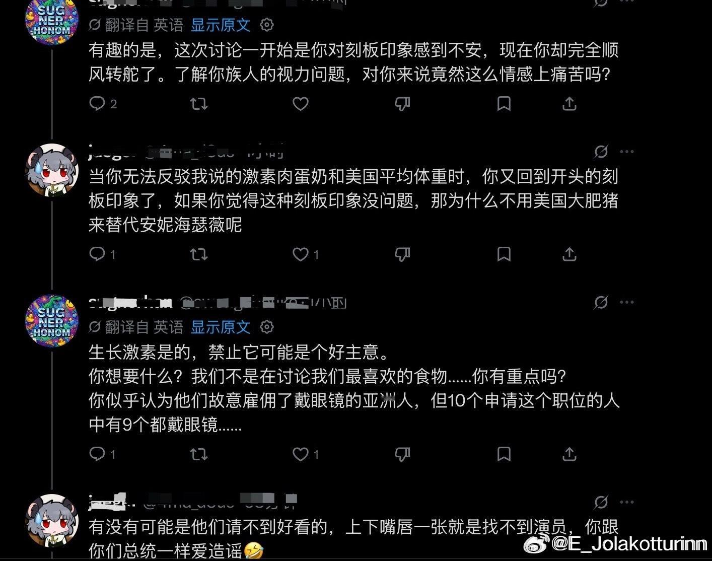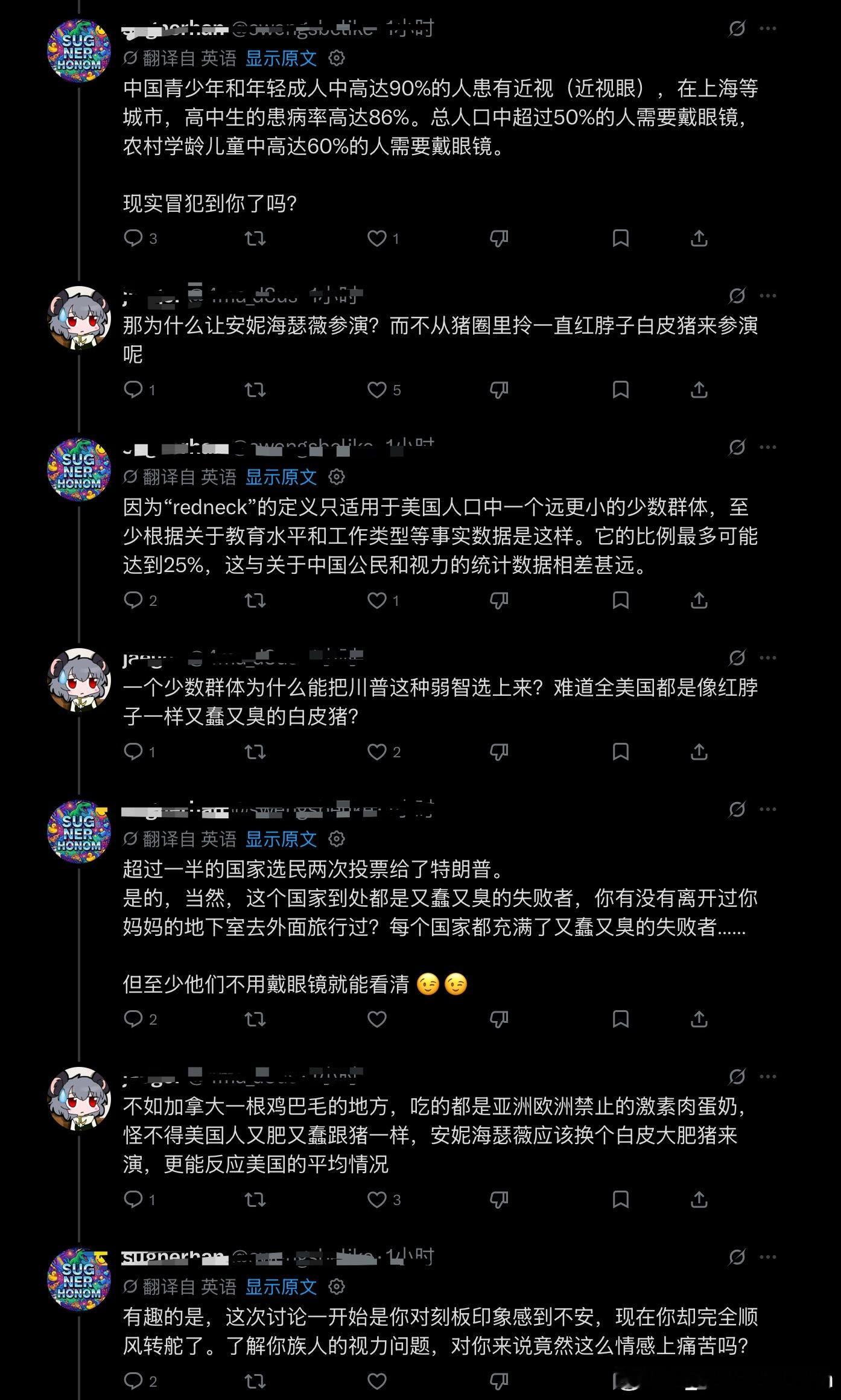 用户10xxx20 2026-04-23 07:37 你甚至可以认为亚裔人群,甚至华裔就是戴眼镜的,那又怎么样?你可以把亚裔群体的平均知识水平和美国白人的平均知识水平做个对比来进行攻击,那种顾左右而言他且自以为是的说法,我怎么感觉就像助攻一样[doge]
