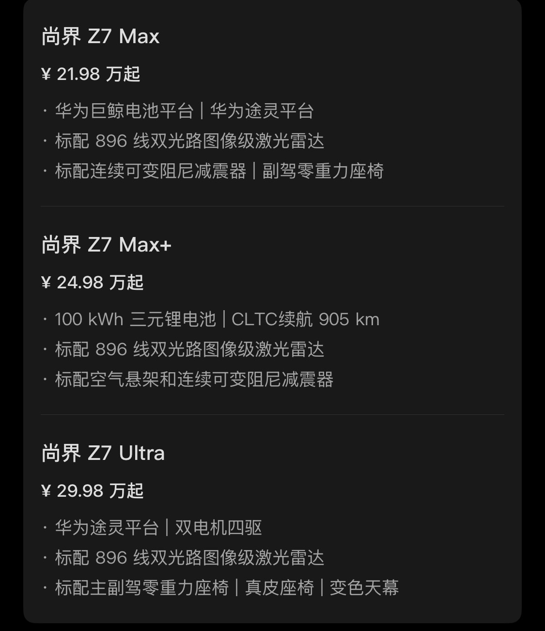 全系标配华为乾崑智驾ADS 4.1、896线双光路激光雷达、途灵底盘及巨鲸800V高压平台。Max版搭载81kWh电池,CLTC续航732-712km;Max+版升级100kWh电池,续航提升至905-873km,新增空气悬架;Ultra版为双电机四驱,零百加速3.44秒,CLTC续航778km,标配20英寸高性能鸳鸯胎。