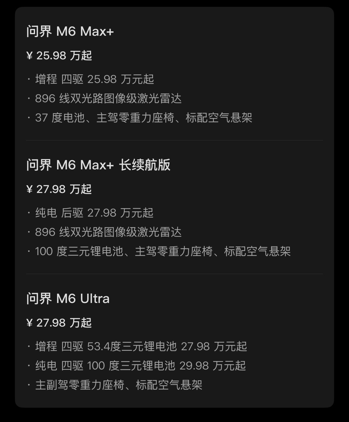 问界M6 价格来了增程Max+:25.98万增程Ultra:27.98万纯电Max+长续航:27.98万纯电Ultra:29.98万