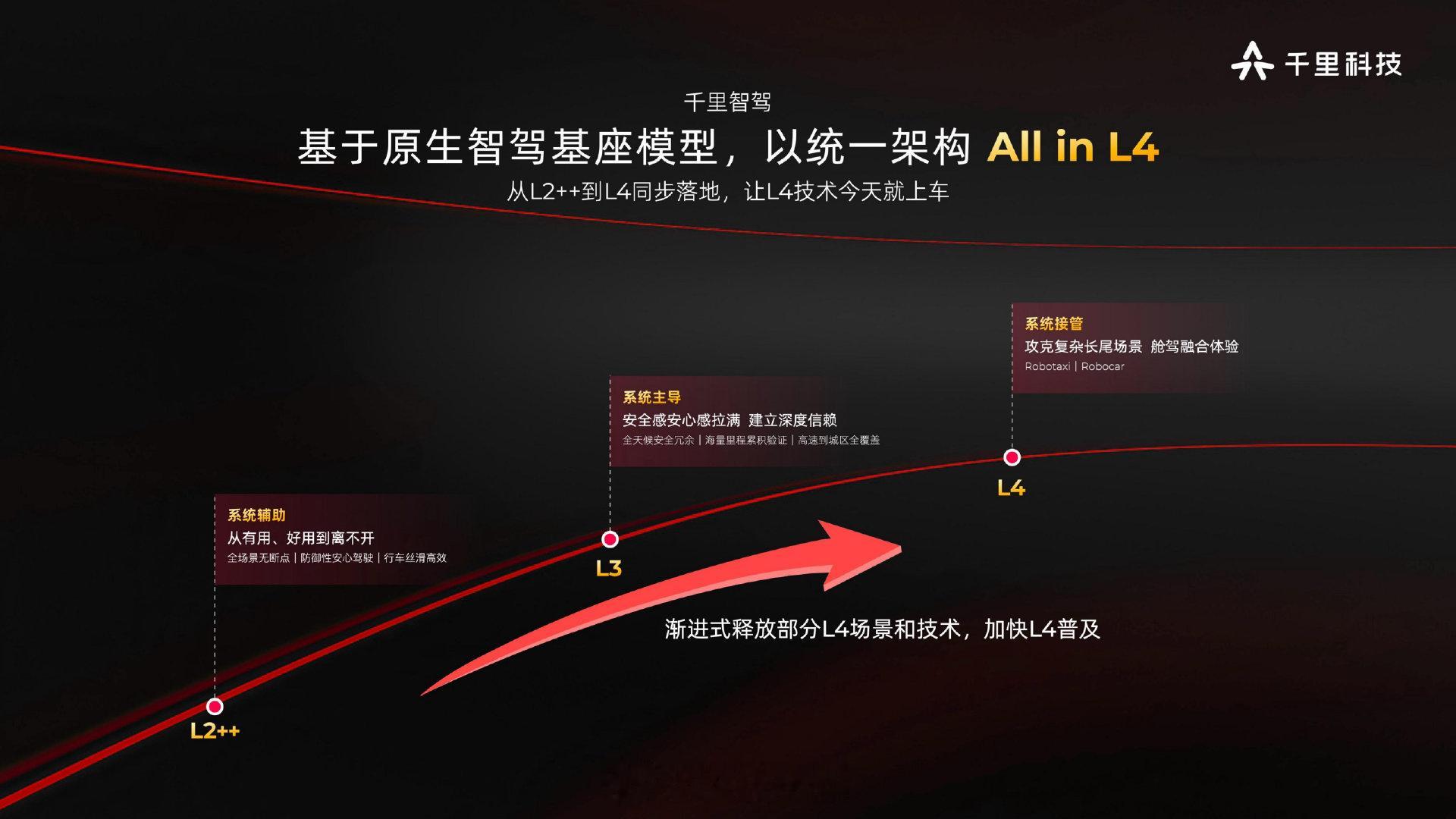 千里科技这场AI战略发布会,核心并非发布某项单一新功能,而是系统性地把“AI+车”的完整战略摆上台面。一边全力冲刺L4级自动驾驶和Robotaxi,另一边则同步推进L2级智驾、新一代智能座舱以及全新品牌布局。