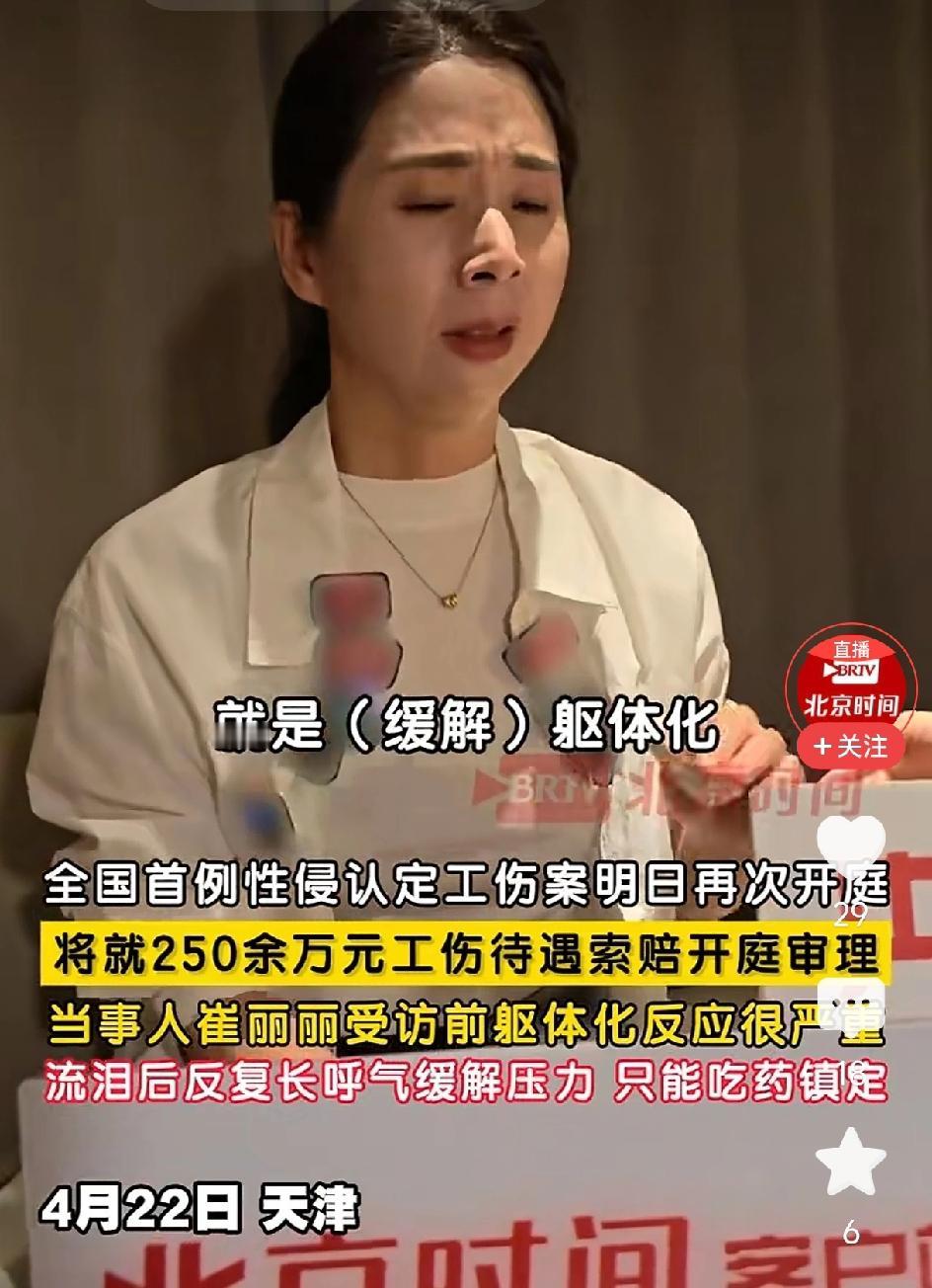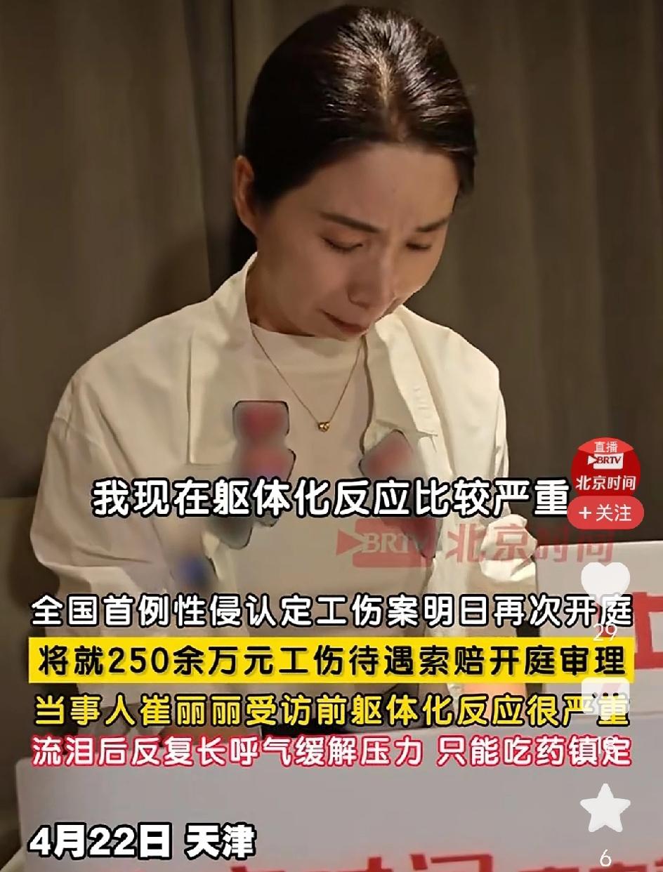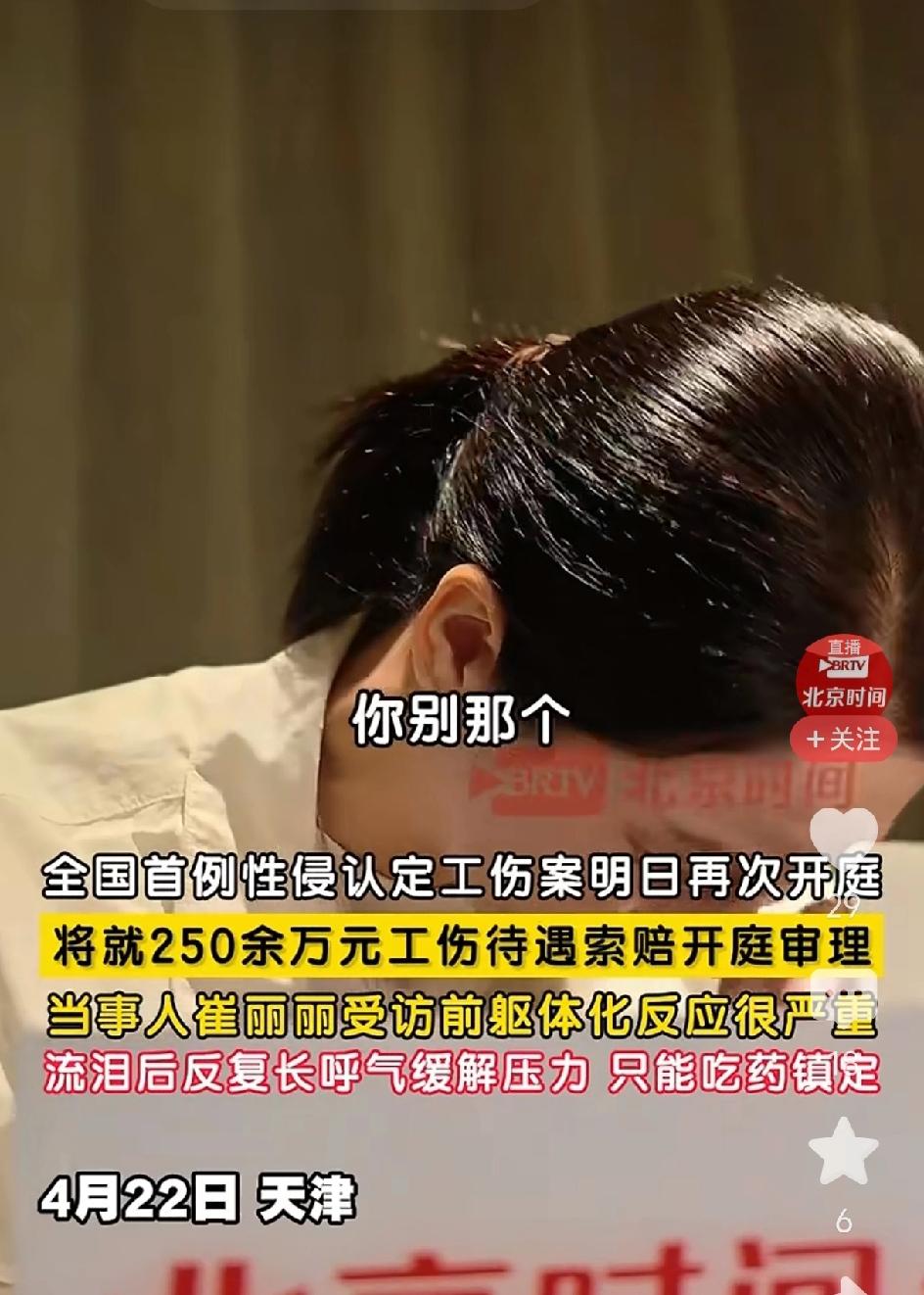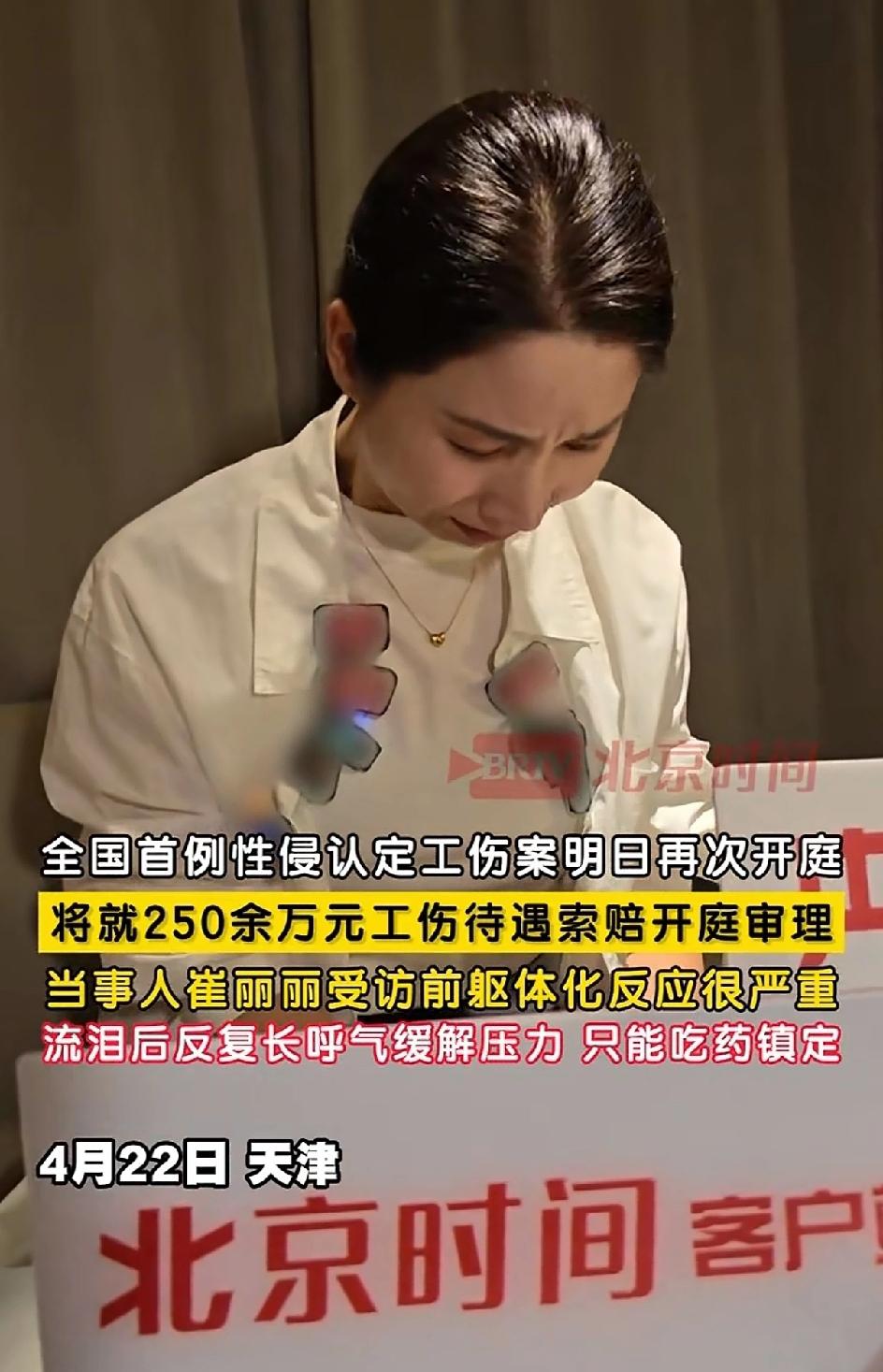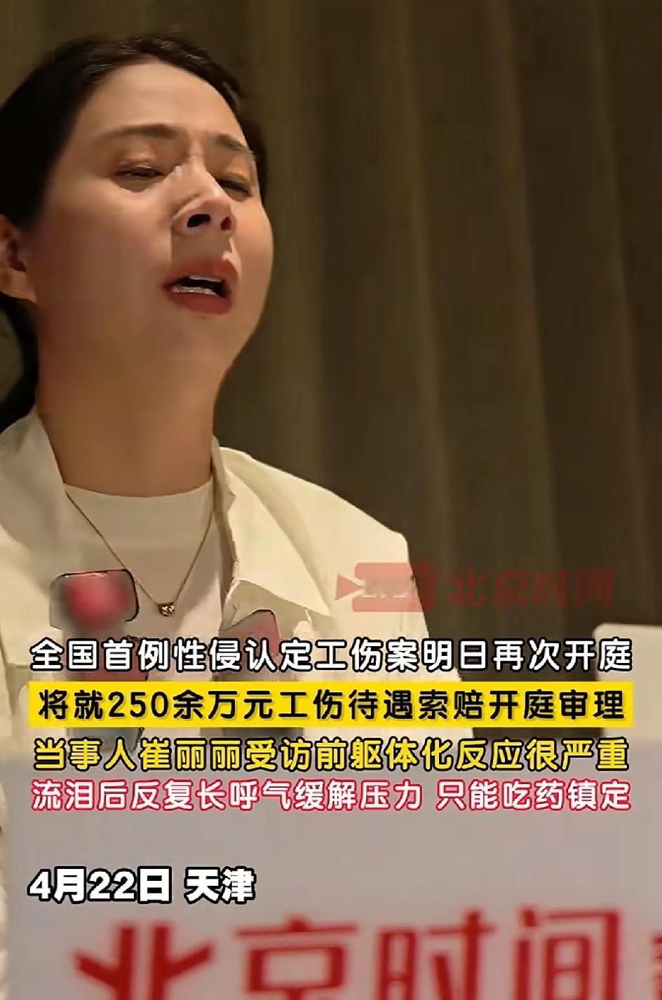 崔丽丽案今日开庭,开庭前她躯体化反应比较重,还吃了一颗药,面对记者的采访,几次间断,她痛哭流涕。250万的工伤认定将再次审理。