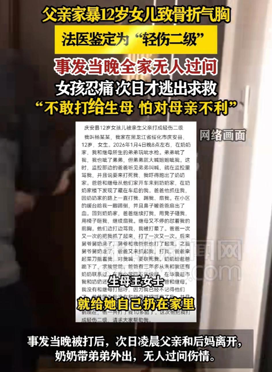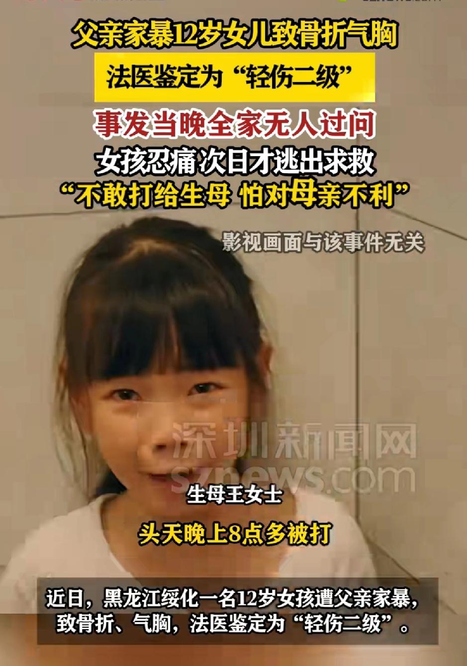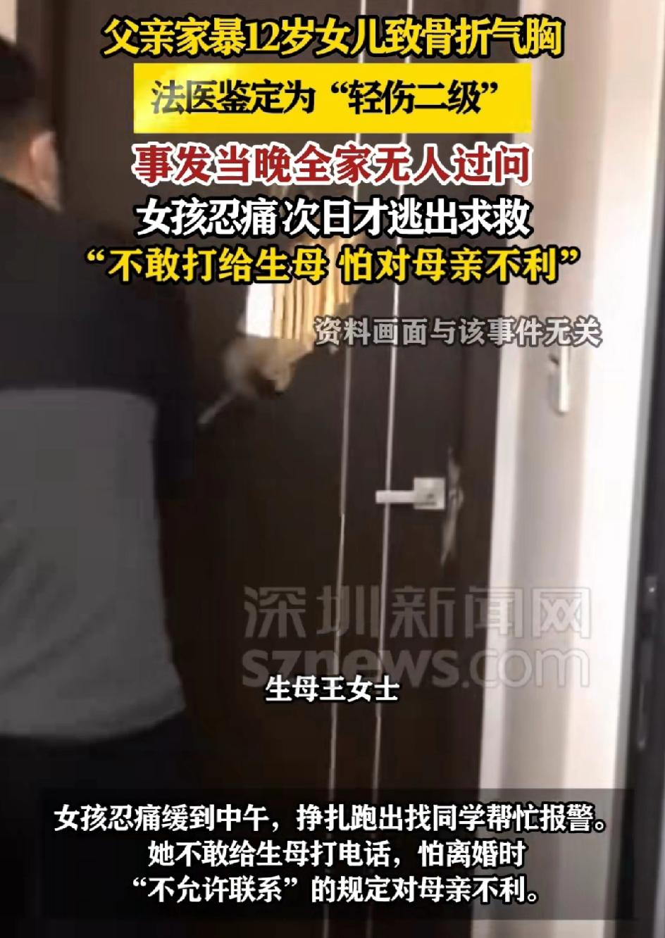 父亲家暴12岁女儿致其骨折。事发当天全家无人过问。女孩忍痛次日才逃出求救,不敢给母亲打电话,怕对母亲不利。因为父母离婚的时候,不能再联络母亲。