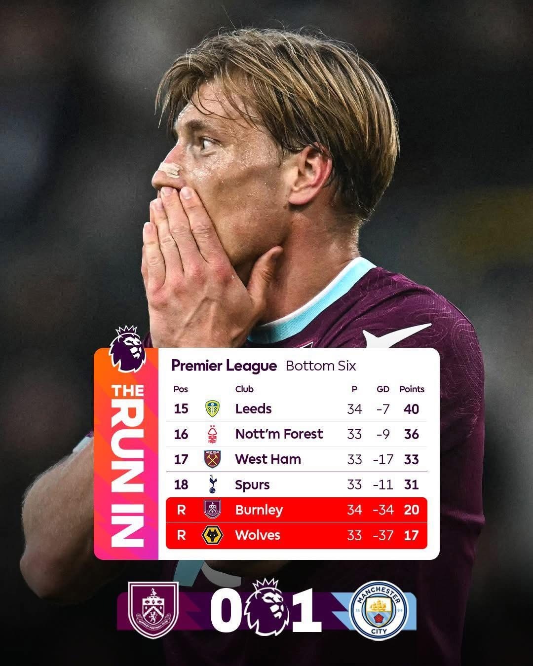 夏蘭特一箭定江山,曼城以較多得球(入球數)壓倒同積分、同得失球差,坐足頭把交椅200幾日嘅阿仙奴升上榜首。般尼輸波之後,肯定冇辦法離開降班區,繼2022年、2024年之後再一次喺英超護級失敗。🤷❌